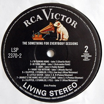 THE SOMETHING FOR EVERYBODY SESSIONS Side A: There's Always Me (Take 2)/ Give Me The Right (Takes 3, 2)/ It's A Sin (Takes 1, 2)/ Sentimental Me (Take 1)/ Starting Today (Take 1)/ Anything That's Part Of You (Take 2)/ Gently (Takes 1, 2) Side B: I'm Coming Home (Take 2)/ In Your Arms (Take 1)/ Judy (Take 4)/ I Want You With Me (Take 1)/ I Slipped, I Stumbled, I Fell (low key)/ Little Sister (Takes 7, 8, 9)/ (Marie's The Name) His Latest Flame (Takes 3, 4)/ I Slipped, I Stumbled, I Fell (Take 11) Side C: I Feel So Bad (Take 1)/ I'm Coming Home (Takes 1, 3)/ Gently (Take 3)/ There's Always Me (Take 4)/ Judy (Takes 2, 3)/ Good Luck Charm (Take 1)/ Put The Blame On Me (Master) Side D: Little Sister (Take 6) 02. (Marie's The Name) His Latest Flame (Takes 10, 11, 12)/ Anything That's Part Of You (Ttakes 4, 5)/ There's Always Me (Takes 5, 6, 7, 8, 9)/ Judy (Takes 5, 6, 7)/ I'm Coming Home (Takes 5, 4) Released: November 14, 2014 Cat.-No.: LSP 2370-2 (506020-975075) Format: 12'' / 33 ? rpm (2 Record Set) |