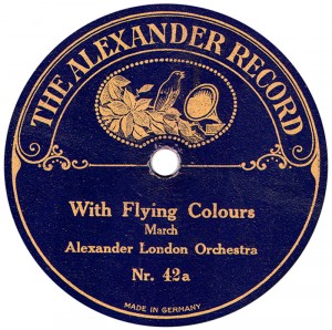 Company of Birmingham, Chester, Coventry & Manchester. The catalogue series are the same as the Beka discs from whence the masters are all derived. They started at 1 or 100; the highest known being 478, the Beka issue of which was issued in late 1911. Alexander were not advertised in the trade journals of the time, leading to suspicion that it may have been a "tallyman" label, sold directly to customers, like John Bull records. |