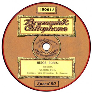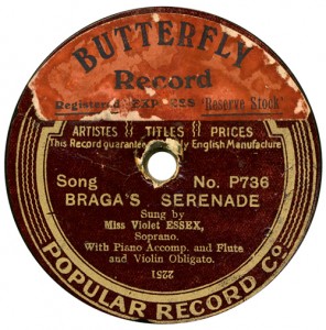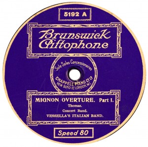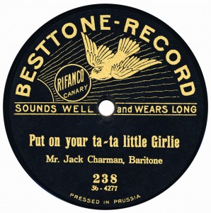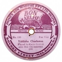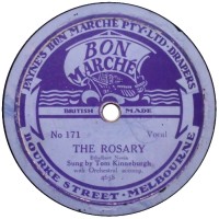 | Manufactured in or near Tonbridge, Kent, by Crystalate for Payne’s ‘Bon Marché’ Drapers store, Bourke Street, Melbourne. The discs are scarce, even in Australia. Jack Gould is a pseudonym for Geoffrey Gelder’s Kettner’s Five. Though recorded in December 1926, it is still a mechanical recording; Crystalate did not adopt the electrical system until 1927 – probably the last company to do so. ‘The Rosary’, actually by the celebrated Scottish bass Tom Kinniburgh, was recorded 16th March 1927, and first appeared on Imperial 1746. | ||||