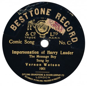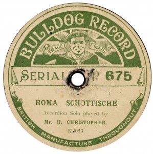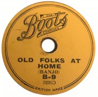 | In about 1922, Boots the Chemists, a manufacturing chemical company who also had (& still do) a huge nationwide chain of pharmacies, had records made for them by the Universal Music Company – often loosely referred to as ‘Vocalion’. They were small discs, and came in two sizes: 5.375" (13.5cm) and 6.5" (16.5cm). It is not known which came first. 6.5" is a most unusual diameter for ‘mini-discs’; possibly unprecedented. They were double sided. They are hardly ever seen, so the venture probably didn’t last very long. Indeed originally, the very few known, all had the Boots logo defaced, and this gave rise to the theory that they may never have been put on sale, and may have been given out as ‘freebies’ once the Boots mark had been obliterated. | ||||