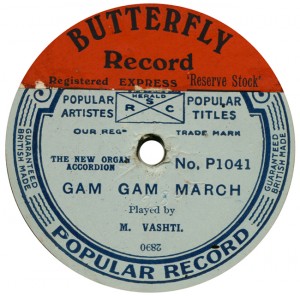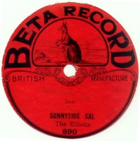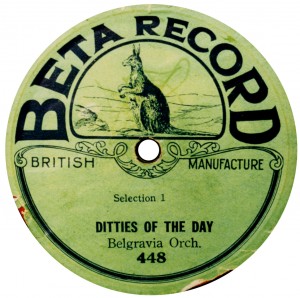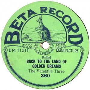 | Beta Records: These labels are over-stuck on Edison Bell Winner records, destined, rather obviously, for the Australian market. They carry the correct artiste credit. Winner 3266 was issued in January 1919, and the Beta used the same number. The others use the last three digits of the Winner catalogue number. ‘Blue Blazes’ was on Winner 3338 of September 1919, and The Versatile Three was on Winner 3360 in January 1920. It is rather likely that these were surplus ‘old stock’ Winners sold off to an entrepreneur who had the labels made. If so, Beta records may date from circa 1922. | ||||