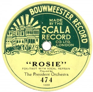above. Their masters were in an AR-150 or 200 block. There was also a 12" (30cm) 6000 series; their labels were red on white, and their masters in an AR-1000 block. In addition, some material was supplied by British Scala from masters of their own, or masters they had leased, as in the case above: Bouwmeester 474 is the same as U.K. Scala 474.The band is Joe Coleman’s President Orchestra, recorded by Gennett in New York in early 1921. Jan tells us that Bouwmeester records first appeared in 1921. There was a two-way traffic in masters, for several sides by violinist Jacques Benavente, recorded for Bouwmeester, also appeared on the British ‘Scala Ideal’ label. The label is often referred to as ‘Bouwmeester Scala’, but to be pedantic for once, it is obviously just ‘Bouwmeester Record’; the prominence given on the label to the word ‘Scala’ doubtless accounting for its being ‘rolled into’ the name. More images, including the 3000 and 6000 series may be seen at: https://www.discogs.com/label/1005829-Bouwmeester-Record |