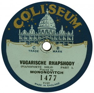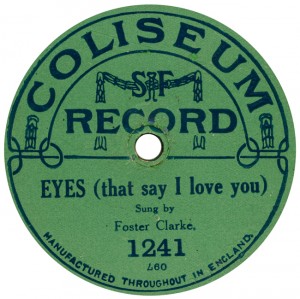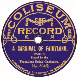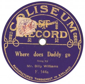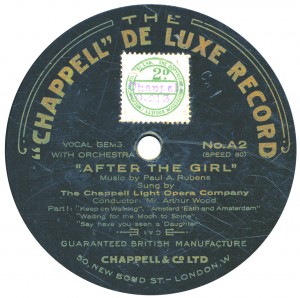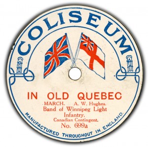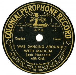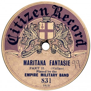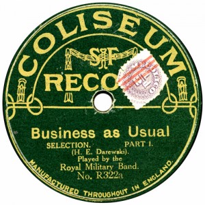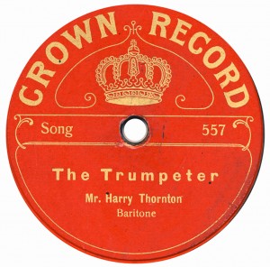 (sometimes just the title) on the original Columbia label underneath. The discs were recorded not later than 1905. Frank Andrews informed Arthur that single-sided Columbia were all deleted in 1908, so you may surmise that Selfridges bought some – or all – of the remaining stocks and stuck their own labels on them. Seven examples turned up together, but Arthur had never seen one before, thus making this label exceptionally scarce. Also we can also show another type, which differs by having only a ‘half-label’. Thus, Selfridge’s are not mentioned, and the disc actually displays not only the original Columbia catalogue number, but also the rightful maker. Obviously, we wonder which sort came first? Well, many early single-sided Columbias carried a ‘back sticker’ – a printed label listing patent numbers, resale price maintenance &c. (one type of these – there were several versions – may be seen under Columbia, above). Reports state that the ‘back sticker’ on one of these discs have been covered up with black paper. This must have been tedious, not to mention the cutting out of variously-shaped slots in the full Crown Perfect label. Accordingly, it is suggested that this ‘fiddly’ procedure was employed first; and that later, Selfridges abandoned it, settling for the half-label, either with or without the approval of Columbia. (26710 has no ‘back sticker’ anyway; its use was eventually abandoned by Columbia – another indicator that the half label is later?) |