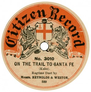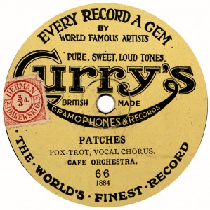 of the machines and discs crashed after about 1910, progressively to 1914. Curry’s was probably the first ‘chain’ of these shops; they already had ‘Depots in Many Towns’ as early as 1910, when the first series of discs above, drawn from Edison Bell ‘Bell Disc’ appeared. The first yellow label issues are derived from Guardsman. The last two discs date from about 1924, and the first bears a Grammavox master dating from about October 1913. And the rest is history. A century later, the nationwide chain of Curry’s Discount Warehouses stand in the forefront, everywhere! “The U.K.’s Foremost Electrical Retailer” is their byline. There was evidently money – lots of it – to be made from bicycles and records, as long as you managed the business well. Later they had other labels, called Portland and Westport. They seem to have abandoned records by about 1930; but that is beyond the scope of these pages. |