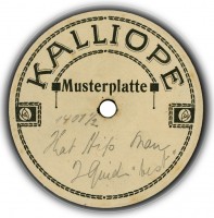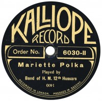 appeared here, under the name ‘Our Flag’. Following the settlement of the dispute with Blum, Kalliope records bearing London-recorded material finally appeared in November 1913, though Blum did not handle them. As all German imports ceased in August 1914, there was not much time for them to flourish. Still, following an initial release of 250 items, the catalogue had built to 300 discs by January 1914, and they do turn up from time to time, and are well recorded & pressed & the labels are reassuringly uniform, as you can see. One interesting point is the ‘Band of H.M. 12th Hussars’ – this is a very good band, but some of them are German recordings and indeed, the band name itself is German. ‘H.M.’ is actually Kaiser Wilhelm II, and the 12th Hussars are ‘The Thuringian’. Our 12th Regiment of Horse was the 12th Lancers! |