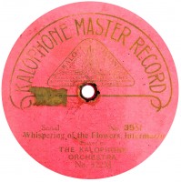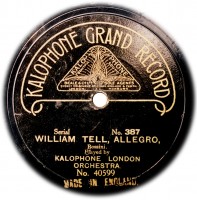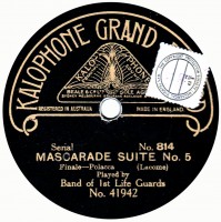 This is a scarce Australian label. It was made in the U.K. by Lindström-Beka for Beale & Co., of Sydney, and would have been pressed at the Lindström works at Hertford. Kalophone 387 is the same as Beka 387. The Beka was issued in February 1911. And Kalophone 814 is a ‘clone’ of Beka 814 – there were only 5 parts to P Lacome’s ‘Mascarade Suite’; the reverse is ‘Berceuse’ by the same composer. That Beka was issued in March 1914. The German-based Lindström group was suppressed in this country in 1916, so an estimate of say 1913 to 1916 would be reasonable for this label, with its nice Lyre Bird trade mark. Note that the earlier disc is rubber-stamped ‘Made in England’ in gold ink; the later one states this on the label, along with the fact that ‘Kalophone’ is a trade mark registered in Australia. Recently from Australia, a 12" (30 cm) disc, called ‘Kalophone Master’ record. This co-ordinates perfectly with its Beka origin, for their 12" discs in the U.K. were called ‘Beka-Meister’; though, clearly, the Australian market insisted on an English equivalent! This disc was recorded in Berlin, issued in the U.K. in July 1911, and sometime a little later, on Kalophone-Master in Australia. |