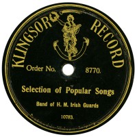 The Klingsor company was noted for its gramophones which had an ‘Aeolian Harp’ of strings stretched across the mouth of the horn. The strings were supposed to be set into vibration by the music, thus enhancing it. The horn was usually concealed in an upright cabinet. Their machines (eventually manufactured in this country) are scarce and very much sought after. Their records were made by Polyphon, and so show the odd feature of that make: the end of the run-off groove goes underneath the label. They bear the Polyphon trade mark. Klingsor records appeared here in 1910, but in late 1911, Polyphon opened its own branch in London, and Klingsor was, in effect, absorbed back into Polyphon. These discs are elusive, but turn up very occasionally. |