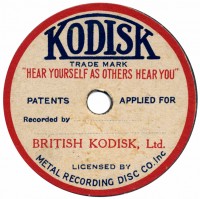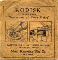 In these pages, we have several times described the search for an unbreakable record as the ignis fatuus of the record industry from earliest times. But a close contender would be the production of a simple and cheap means by which the public could make their own sound recordings. Cylinder phonographs that had a feed-screw (most of the half-decent ones had them) had always allowed their owners the facility to do so. You only needed to change the reproducer for a recording version, slip a blank soft wax cylinder onto the mandrel, and off you went! With discs it was considerably more difficult to contrive a home recording device. But in the U.S.A. in 1921, the inventive mind of Victor Emerson – already a veteran of the record industry – thought of, and patented, a pre-grooved metal disc. This would guide the sound-box of your gramophone across the disc, while at the same time, you spoke or sang into the horn of the gramophone. With any luck, the gramophone would act in reverse, and emboss your vocal efforts on the hitherto smooth walls of the groove. It may have worked quite well at the time. But alas, it would seem that in the intervening 90 years, those transient modulations have disappeared, as it were, resorbed into the groove. Adding together all the known instances of present-day owners of Kodisks, I can state categorically that of over thirty known examples, not a single one is claimed to replay anything comprehensible. Quite apart from this, the ire of the Kodak film & camera company was kindled, not only by the name Kodisk, but also by the phrase ‘Snapshots of your voice’. Kodak cameras took the ‘snapshots’, OK? The slogan had to be changed to the rather biblical ‘Hear yourself as others hear you’, and stickers placed on packets (and indeed some discs) declaring that Kodisk was nothing to do with Kodak. A dedicated ‘megaphone’ was available as an accessory; there was also a sound-box, at least in the U.S.A. |