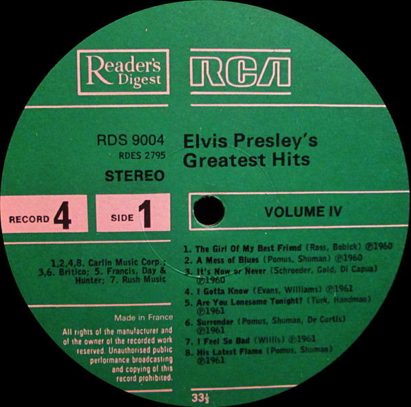 Presley's Greatest Hits Label: Reader's Digest – GELV-6A, RCA – GELV-6A Format: 6 x Vinyl, LP, Compilation, Vinyl, LP, Album, Compilation, Stereo, Box Set, Stereo, Sonopress Pressing Country: UK Released: 1975 RCA – GELV-6A, |