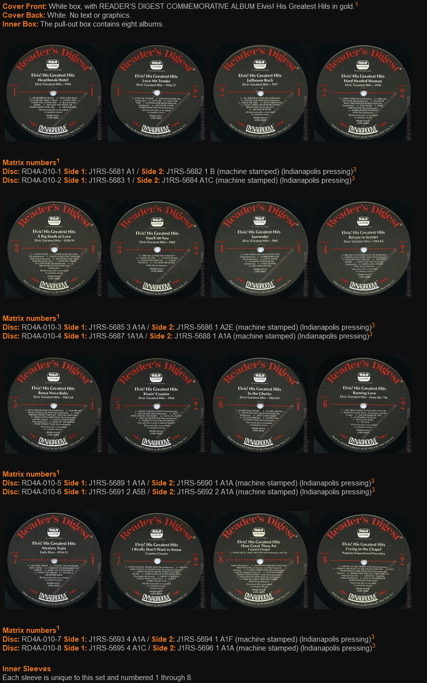 Want Me (That'S How I Will Be) - Hound Dog Record 1 Side 2 : Love Me Tender - Too Much - Love Me - I Was The One - Plaing For Keeps - (Let Me Be Your) Teddy Bear Record 2 Side 1 : All Shook Up - Loving You - Treat Me Nice - Blue Christmas - That'S When Heartaches Begin - Jailhouse Rock Record 2 Side 2 : Don't - I Beg Of You - Wear My Ring Around Your Neck - One Night - King Creole - Hard Headed Woman Record 3 Side 1 : I Got Stung - (Now And Then There's) A Fool Such As I - I Need Your Love Tonight - My Wish Came True - Doncha Think It's Time - A Big Hunk O' Love Record 3 Side 2 : Are You Lonesome Tonight - Stuck On You - I Gotta Know - Fame And Fortune - A Mess Of Blues - It's Now Or Never Record 4 Side 1 : Can't Help Falling In Love - Surrender - Little Sister - Flaming Star - I Feel So Bad - His Latest Flame Record 4 Side 2 : Return To Sender - Good Luck Charm - Follow That Dream - Wooden Heart - She'S Not You - Rock-A-Hula Baby Record 5 Side 1 : Blue Hawaii - You're the Devil In Disguise - One Broken Heart For Sale - Bossa Nova Baby - Such A Night - King Of The Whole Wide World Record 5 Side 2 : Kissin' Cousins - Ask Me - Ain't That Loving You Baby - Viva Las Vegas - Kiss Me Quick - What'd I Say Record 6 Side 1 : Suspicious Minds - In The Ghetto - (Such An) Easy Question - Don't Cry Daddy - If I Can Dream - Puppet On A String Record 6 Side 2 : You Don't Have To Say You Love Me - Burning Love - The Wonder Of You - Steamroller Blues - Kentucky Rain - My Way Record 7 Side 1 : Mystery Train - I'm Left, You're Right, She's Gone - I Forgot To Remember To Forget - Baby, Let's Play House - That's All Right - You're A Heartbreaker Record 7 Side 2 : Your Cheatin' Heart - I Really Don't Want To Know - When My Blue Moon Turns To Gold Again - There Goes My Everything - Have I Told You Lately That I Love You - I Can't Stop Loving You Record 8 Side 1 : How Great Thou Art - Somebody Bigger Than You And I - In The Garden - It Is No Secret (What God Can Do) - His Hand In Mine - Take My Hand, Precious Lord Record 8 Side 2 : Crying In The Chapel - (There'll Be) Peace In The Valley (For Me) - Put Your Hand In The Hand - Where Did They Go Lord - I Believe - You'll Never Walk Alone |