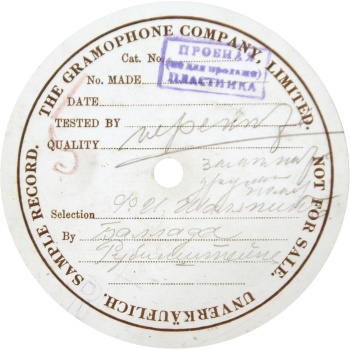 Zonophone Company. Military operations of 1914 had forced company to relocate the manufacture from Riga to Moscow where on the Stshipok Street the Writing Amour (Pishushij Amour) plant had been established. In the beginning of 1918 the Moscow factory was stopped. All its equipment had been moved to the "Fifth Anniversary of October" factory (former Brothers Pathe factory). |