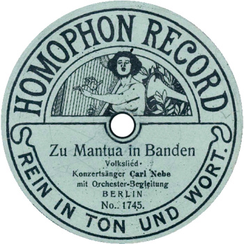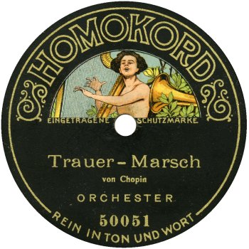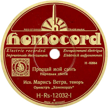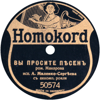 | The gramophone records Homokord (after 1923 some labels say also Homocord) were manufactured by German company Homophon Company GmbH established in 1905. The company headquarters was located at Alexandrinenstrabe in the part of city of Berlin known as Kreuzberg. In the beginning they supposed, that Homokord will be able to establish itself on the Russian market, they even planned to open a branch in the Polish city of Kalisz. However, ill choices of artists and inadequate requirements to the artistic quality of the recordings had resulted in graduate reduction of this company business in Russia. The latest Russian Homokord recordings are dated by 1910, after that date all matrixes with Russian repertoire were sold to the gramophone company Stella Record. On Homokord acoustic matrices present encrypted recording date. The code is interpreted as follows: the first letter of the code is the encrypted month (January = A, December = M), then follows the day of recording, and finally the last letter indicates the year of recording in reverse alphabetical order, starting from the letter V, that is the year of the founding of the company (1905) and ending with the letter A (1925). For example, H21S stands for 21-08-1908. In the last year of acoustic recording (1926) they used the letter W. For electric recording they started to use different encoding system. The table below shows the decryption of months: |