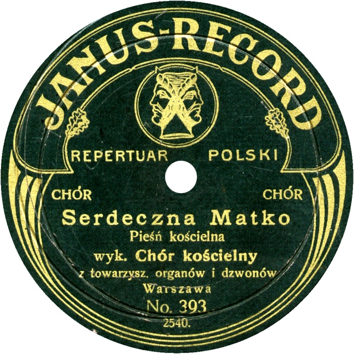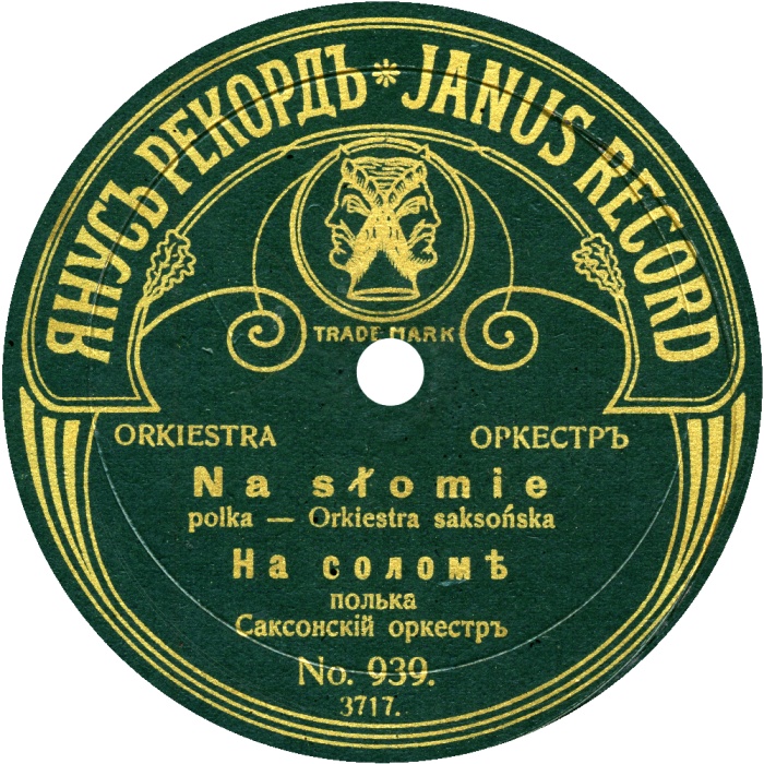 | Janus-Record records with double head of an Antique Roman god, a protector of gates and entrances, were manufactured by German company Vereignigte Schallplaten Werke Janus Minerva G.m.b.H. since 1906. It was a small gramophone enterprise located in Hannover on Limburgstrasse, 1. The enterprise had status of joint-stock company headed by Hermann Deutsch. In Russia, the company mentioned for the first time in 1907. In 1909 the company obtained patent application number 6,746 for improvements in and relating to gramophone records. The first Russian recordings were made in April 1910 in St.-Petersburg, the last ones - in September of the same year on the south of Russia. The Russian representative was Mr. Schenvitz located in Warsaw on 15 Granicza Street. In 1911 they announced that Janus-Record was about to issue a full Russian catalog with about 1000 numbers. Janus-Record also manufactured Polish and Czech records. In 1909 Erhardt Jackel (1874 - 1923) made an attempt to set up a small record pressing plant on small Bohemian (Czechoslovakia) place called Smrzovka. Some numbers of records were produced, but in 1910 the plant was stopped. This company did not play any significant role on the Russian market. |