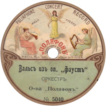 masters bought from German companies Stella, Beka and etc. Judging by the existing copies of records, the company achieved certain perfection in the business of copying somebody else's records: on this record the own announcement is attached to the copied phonogram! One can make this conclusion after careful listening to the record: the announcement sounds indistinctly and faintly, while the orchestra sounds brightly and richly. Supposedly, for achieving this goal they used a pantograph with attached to it mouthpiece. The process might work this way: first they started the recorder, then spoke necessary phrase into the mouthpiece, then without stopping started the playback of the original record. Since all records have more or less prolonged lead-in groove, there should be a lapse between the end of the phrase and the beginning of the actual sound - this is exactly what we observe! Usually there is no such delay on the original recordings. Using this hi-tech technology combined with social skills of Poliakin-senior explains the fact why "all attempts of thieved artists to stop the illegal business ended up without success - wise Poliakin-senior befriended with local police as well as with fathers of the city, so they closed their eyes on all his pranks".After passing of the Copyright Law in March 20, 1911, the company began making its own recording, mostly with folk music. |
