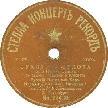 | Stella Record label was used by German company Schallplatten-Vertrieb GmbH. The headquarters and the plant located in Berlin. It had one more factory in Warsaw that was dedicated for pressing phonograph records solely with Russian repertoire. The company began to make Russian recordings at least from November 1909, which follows from an advertisement on this record, where P. D. Orlov directly names the date of recording November 9, 1909 and the name of the label - "Stella". Also, the factory pressed Russian records from Homokord and Anker-Record matrices. After the outbreak of WWI the company halted all its operations in Russia. | |||