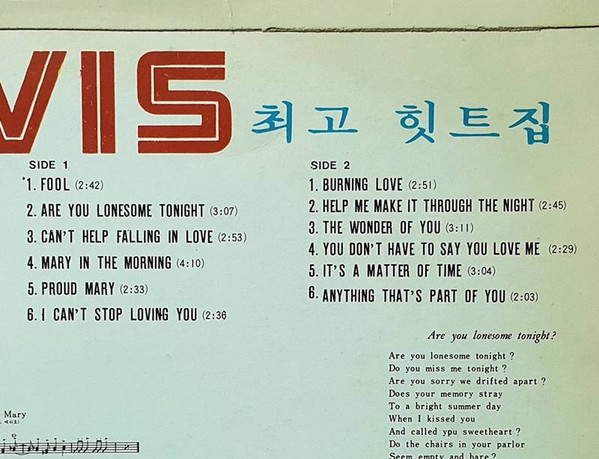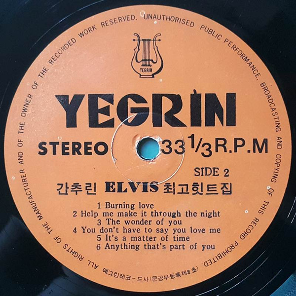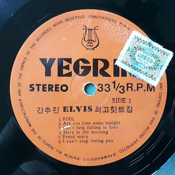Yegrin - PI-001 Format: Vinyl, LP, Compilation, Unofficial Release, Stereo Country: South Korea Side 1: 01: Fool 02: Are You Lonesome Tonight ? 03: Can't Help Falling In Love 04: Mary In The Morning 05: Proud Mary 06: I Can't Stop Loving You Side 2: 01: Burning Love 02: Help Me Make It Through The Night 03: The Wonder Of You 04: You Dont Have To Say You Love Me 05: It's A Matter Of Time 06: Anything That's Part Of You Manufactured By – Yegrin Record CoVia google translate ??? ELVIS ?? ??? = The Best Elvis Hits The English translation is not shown on the release. Korea Release Only. This record was released only in South Korea. Released Date : the 1970s. If anyone knows exactly when it was released, has a link to online details etc, please let us know. |