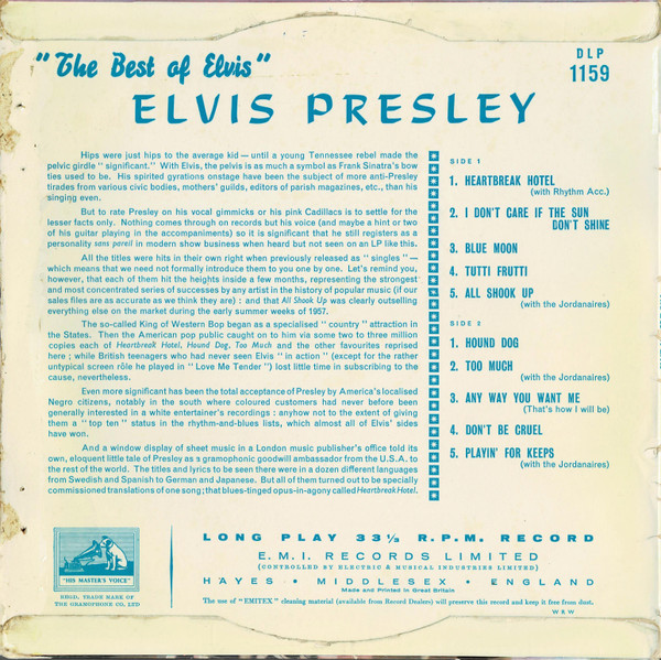 The Best Of Elvis. His Master's Voice DLP 1159. Vinyl, LP. UK. 1957
