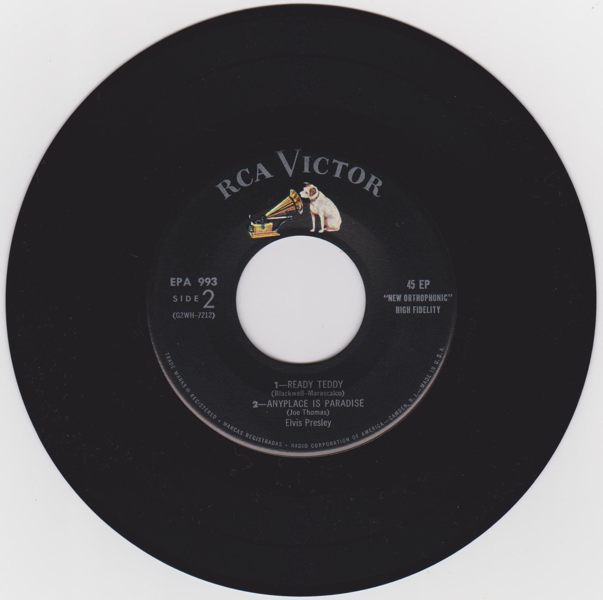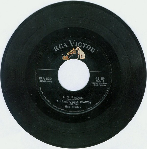 (EP) Pressed By RCA Records Pressing Plant, Hollywood Dog on top with horizontal line. 45 EP on right side. Sides directly below 45 EP and above "NEW ORTHOPHONIC HIGH FIDELITY". RCA Records, Hollywood Pressing Matrix / Runout (Label side A): G2WH-3462 |