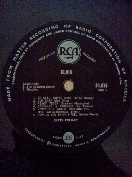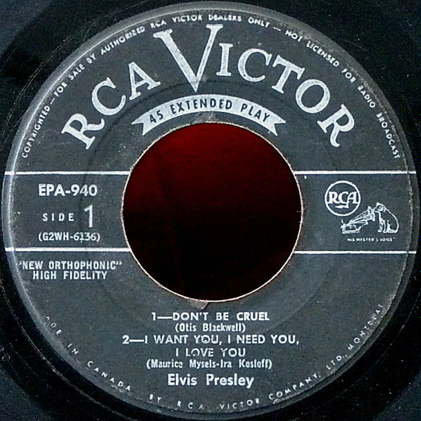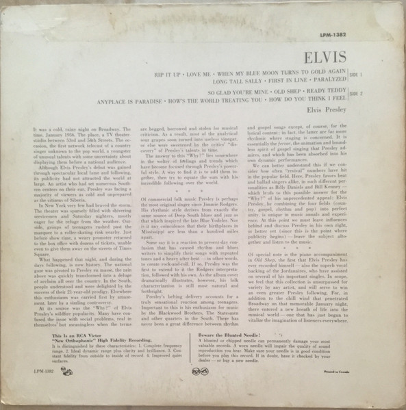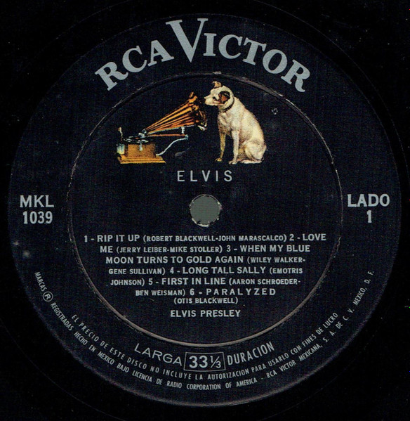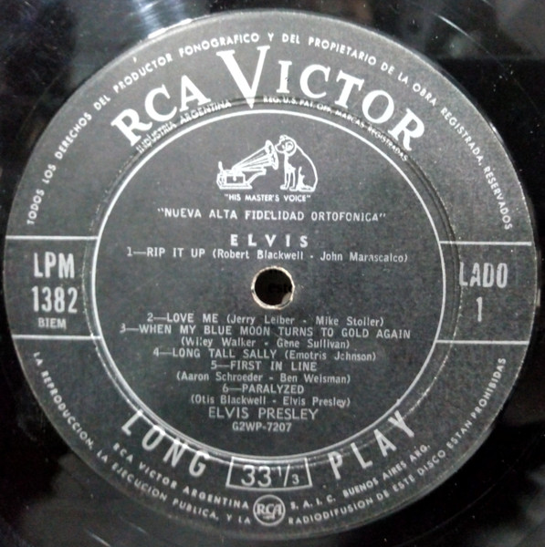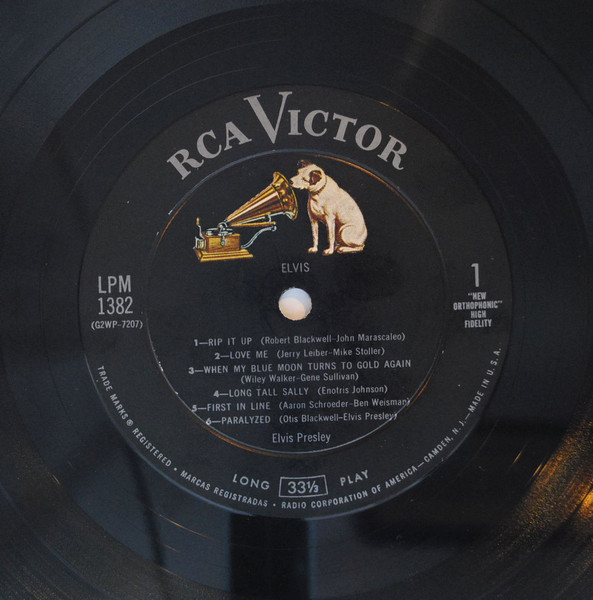 | Elvis Presley Label: RCA Victor LPM-1254 Black label, silver letters, Long Play, dog on top, Orthophonic. Slightly different cover than other Canadian mono pressing in that the RCA logo is a different color and the picture of Elvis is more centered on this copy. Matrix / Runout (Side A label): G2PP-1282 |