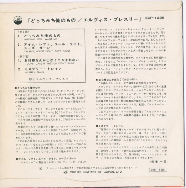 Label: Victor – SCP-1235 Series: Presley Golden Compact Series, Living Stereo Format: Vinyl, 7", 33 ? RPM, EP, Stereo Country: Japan Released: 10 Dec 1965 |