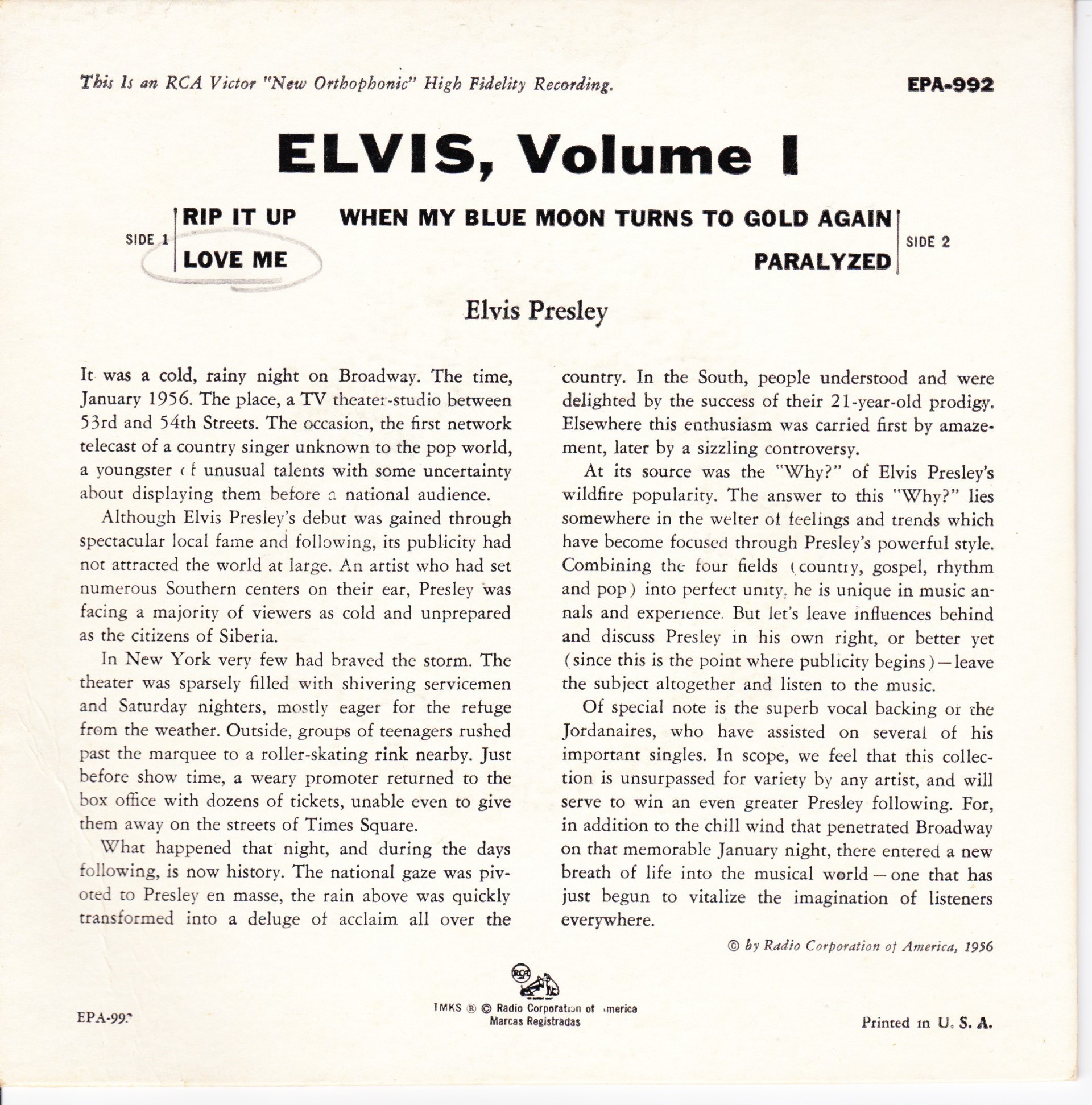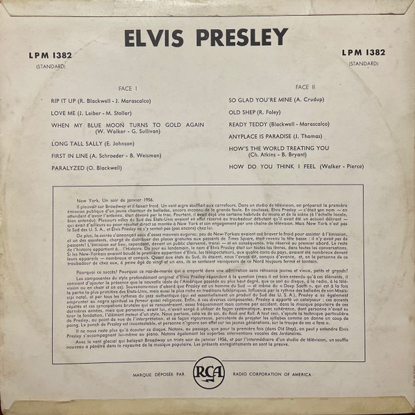 (LP) (US) RCA LPM 1382 Released: October 19, 1956 Side 1 Rip It Up **** Love Me ** When My Blue Moon Turns To Gold Again *** Long Tall Sally *** First In Line **** Paralyzed *** Side 2 So Glad You're Mine * Old Shep *** Ready Teddy **** Anyplace Is Paradise *** How's The World Treating You ** How Do You Think I Feel ** *