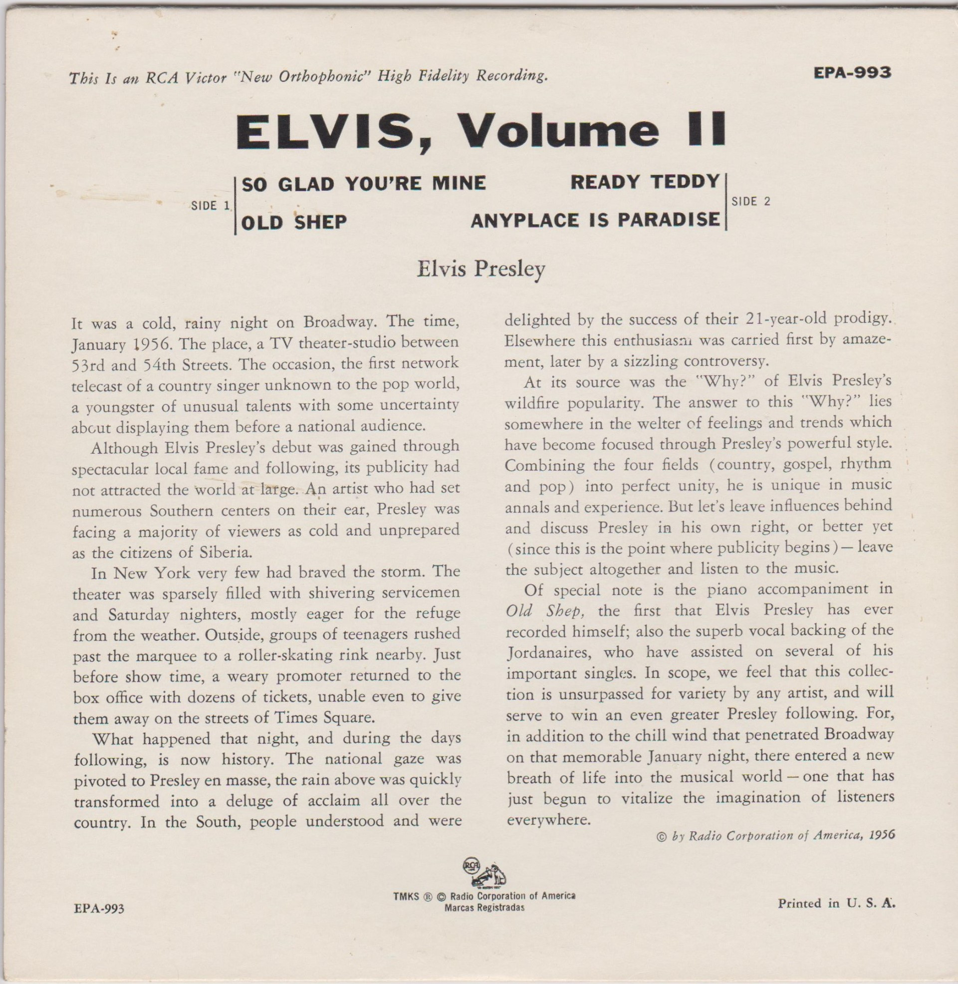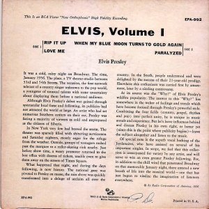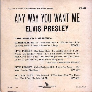 | Details : Front Cover : Elvis photo. Rear Cover : Text only. Label : Black with silver lettering & dog on top. Pressing Plant : Rockaway Matrix Number Side 1 : G2 - WH 7209 - 2S H A RCA 3 (Machine Stamped) Matrix Number Side 2 : G2 - WH 7210 - 2S D A RCA 6 (Machine Stamped) *NOTE* This label has a horizontal line. |