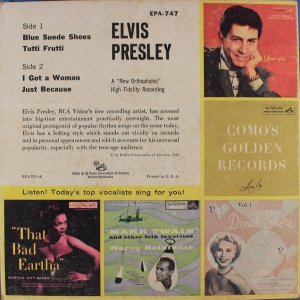 PRESLEY (EP) (US) RCA EPA 747 Released: March 23, 1956 Side 1 Blue Suede Shoes *** Tutti Frutti **** Side 2 I Got A Woman ** Just Because * * Recorded: Sun Studios, Memphis, September 12-16, 1954 ** Recorded: RCA Studios, Nashville, January 10, 1956 *** Recorded: RCA Studios, New York City, January 30, 1956 **** Recorded: RCA Studios, New York City, January 31, 1956 |