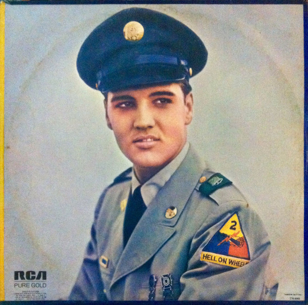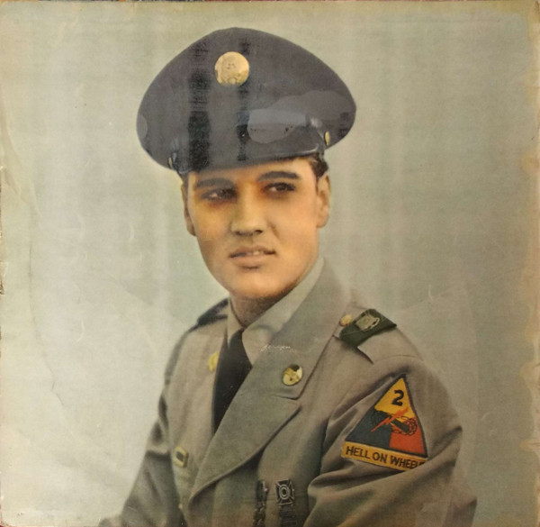 with song titles in white. Matrix Number Side 2 : K2PP - 1149 - 3S V (Hand Etched) *NOTE* Inside gatefold sleeve is a telegram to Colonel Tom Parker from Elvis to pass on to his fans. Song titles in centre. Various Elvis photos in his dress uniform with captions underneath. |