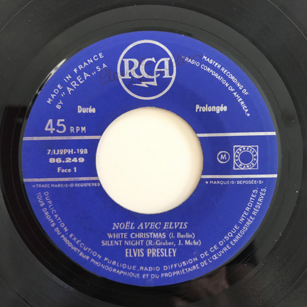 | Elvis Presley Noel Avec Elvis Label: RCA 86.249 Side 1: Side 2 Manufactured By AREA Made in France by AREA from RCA master recording Matrix / Runout (Side A (etched)): 71J2PH128 1D1 |