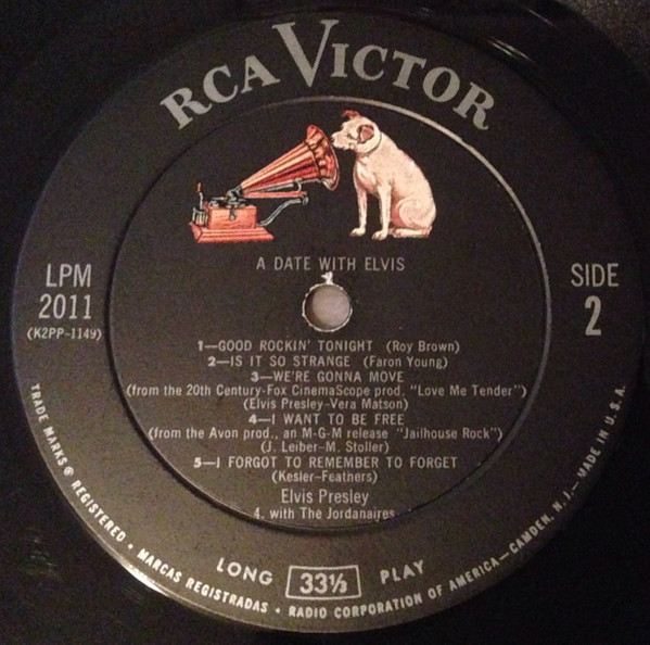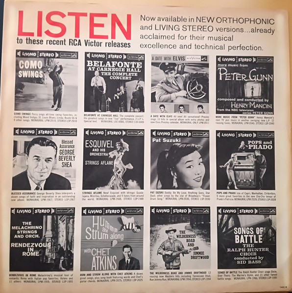 side 1. New Orthophonic on side. Disc: (1965) Black label, dog on side. Disc: (1969) Orange label. |
