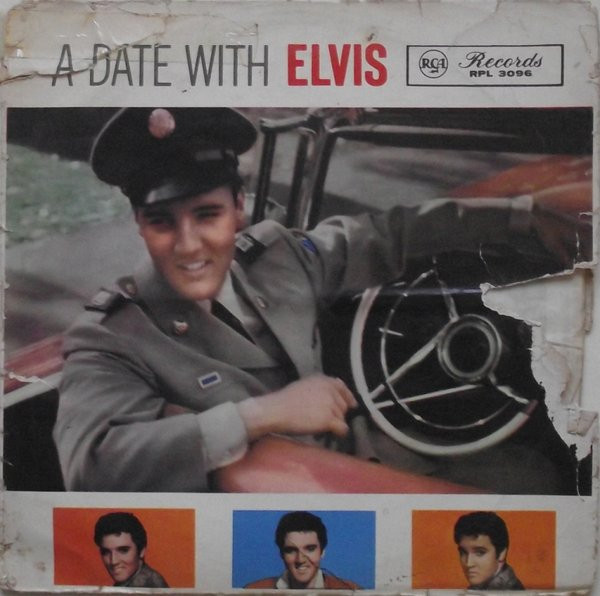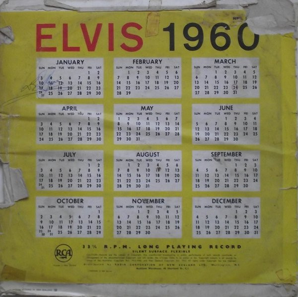 WITH ELVIS (LP) Brief History : A Date with Elvis is the eighth album by Elvis Presley, issued on RCA Victor Records (LPM 2011) in July 1959. It is a compilation of previously unreleased material from an August 1956 recording session at 20th Century Fox Stage One, two from Radio Recorders in Hollywood, and multiple sessions at Sun Studio. The album reached #32 on the Billboard Top Pop Albums chart. After Presley's induction into the army on March 24, 1958, RCA and his manager, Colonel Tom Parker, were faced with the prospect of keeping his name before the public for two years with no possibility of live performances, no movies, and with few unissued marketable recordings in the vault. A recording session was arranged for two days in June, which yielded enough items for five more single sides, singles being the commercial focus for rock and roll in the 1950s. Four of those tracks would be issued on 45s in 1958 and 1959 during his absence while doing military service. Presley, however, also did well in the albums market, all but one of his previous seven LPs charting no lower than #3, and RCA wished to continue promoting albums by Presley given his sales record. Much of Presley's material had not been released on LP, and for this album RCA collected material previously unavailable on album. Like its predecessor For LP Fans Only, this album featured tracks that had been issued on Sun Records with limited release, and were almost impossible to locate beyond certain parts of the south. The remaining five tracks derived from three different EPs issued in 1956 and 1957. Even by the standards of the late 1950s and early 1960s, where long-playing albums often ran to only about 35 minutes, this was a very short album at twenty-three minutes, and as such became the lowest charting Presley LP of the decade. RCA would squeeze one more album in 1959 out of previously issued material, the second singles collection, but it too would be a lower seller by previous standard. Presley would return from overseas in 1960 to commence proper recording again. this album also folds out to be a calendar for the year 1960. Front Cover : 4 Elvis photos. Catalogue number top right. Red sticker