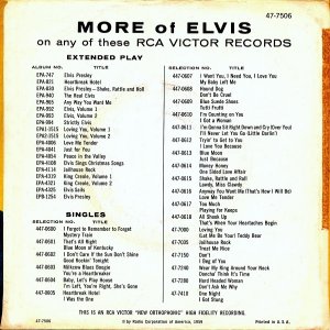 | Details : 1964 Release Front Cover : Elvis in his famous gold suit. Catalogue number top right with "Magic Millions". Printed in U.S.A. bottom right. Rear Cover : Coloured photo of Elvis. Label : Black with silver lettering & dog on top. No Camden N.J. at bottom. Album title above spindle hole. Side 1 : Side 1 on inner label. Side 2 : Side 2 on inner label. Pressing Plant : Indianapolis Matrix Number Side 1 : K2PP - 2713 - 17S C1 (Machine Stamped) Matrix Number Side 2 : K2PP - 2714 - 14S c1 (Machine Stamped) *NOTE* "RE" front cover bottom right. Rear cover has text box to the top left & right. RCA logo is now white. Monaural bottom of vinyl label. |