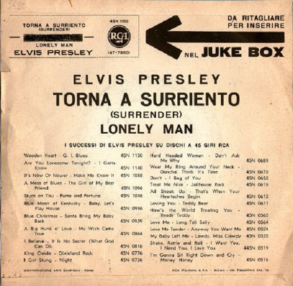 Elvis Presley Single RCA Living Stereo 61-7850 TORNA A SURRIENTO BIEM 1961 |