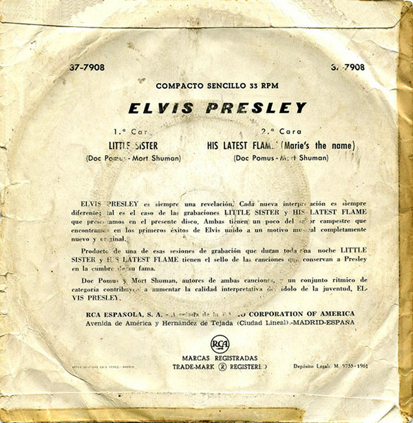 Label: RCA Victor – LC-16003 Format: Vinyl, 7", 33 ? RPM, Single Country: Brazil Released: 1961 Brazilian edition in 33rpm, 1961, black label with Compact Single 33 red and yellow logo. Generic sleeve. Sides were switched from the US release. Track 2 appears on label as "His Latest Flame (Marle's The Name)". |