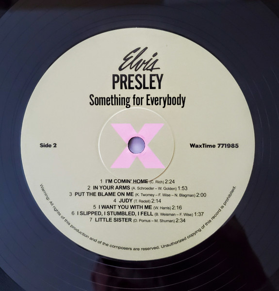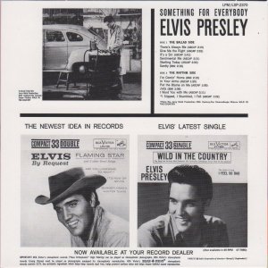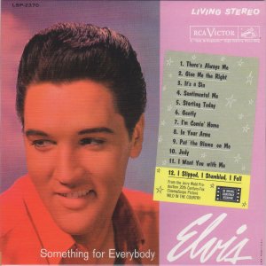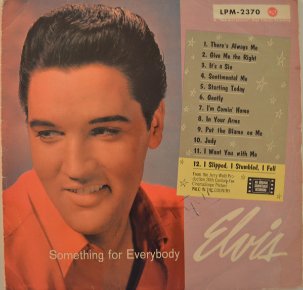 Radio Recorders, Hollywood, November 8, 1960 Something For Everybody is the thirteenth album by Elvis Presley, released on RCA Victor in mono and stereo, LPM/LSP 2370, in June 1961. Recording sessions took place on November 8, 1960, at Radio Recorders in Hollywood, and on March 12, 1961 at RCA Studio B in Nashville, Tennessee. It peaked at #1 on the Top Pop Albums chart. It was certified Gold on 7/15/1999 by the R.I.A.A. After his military discharge from the army in March 1960, any doubts about Presley's ability to recapture the momentum of his career in the 1950s had been laid to rest. During that year his three singles had all topped the charts, and his first album, Elvis Is Back!, had gone to #2 on the album chart. His musical film G.I. Blues had been wildly successful, its soundtrack also going to #1 on the album chart. Pressing on, he entered the familiar Studio B in Nashville and recorded eleven of the tracks for this album in one twelve-hour session, in addition to the single "I Feel So Bad". The single was initially scheduled to be the twelfth track for the album, but Presley chose it to accompany the title track to the film Wild in the Country as the promotional 45 for the film. Another track that had appeared in the film but not released commercially on records, "I Slipped, I Stumbled, I Fell", became the final track for the album. Front Cover : Photo of Elvis. Song titles to right. Catalogue number