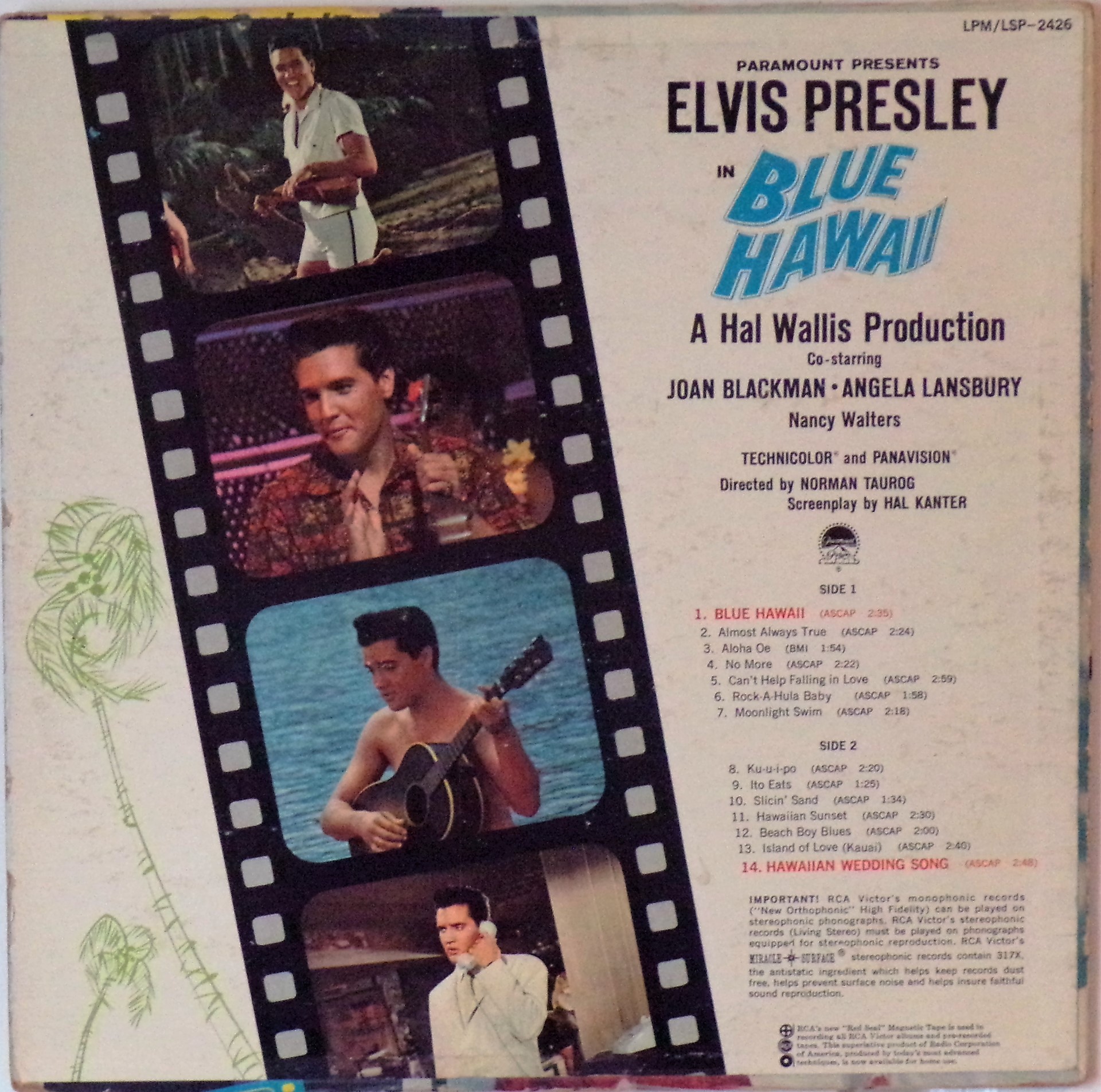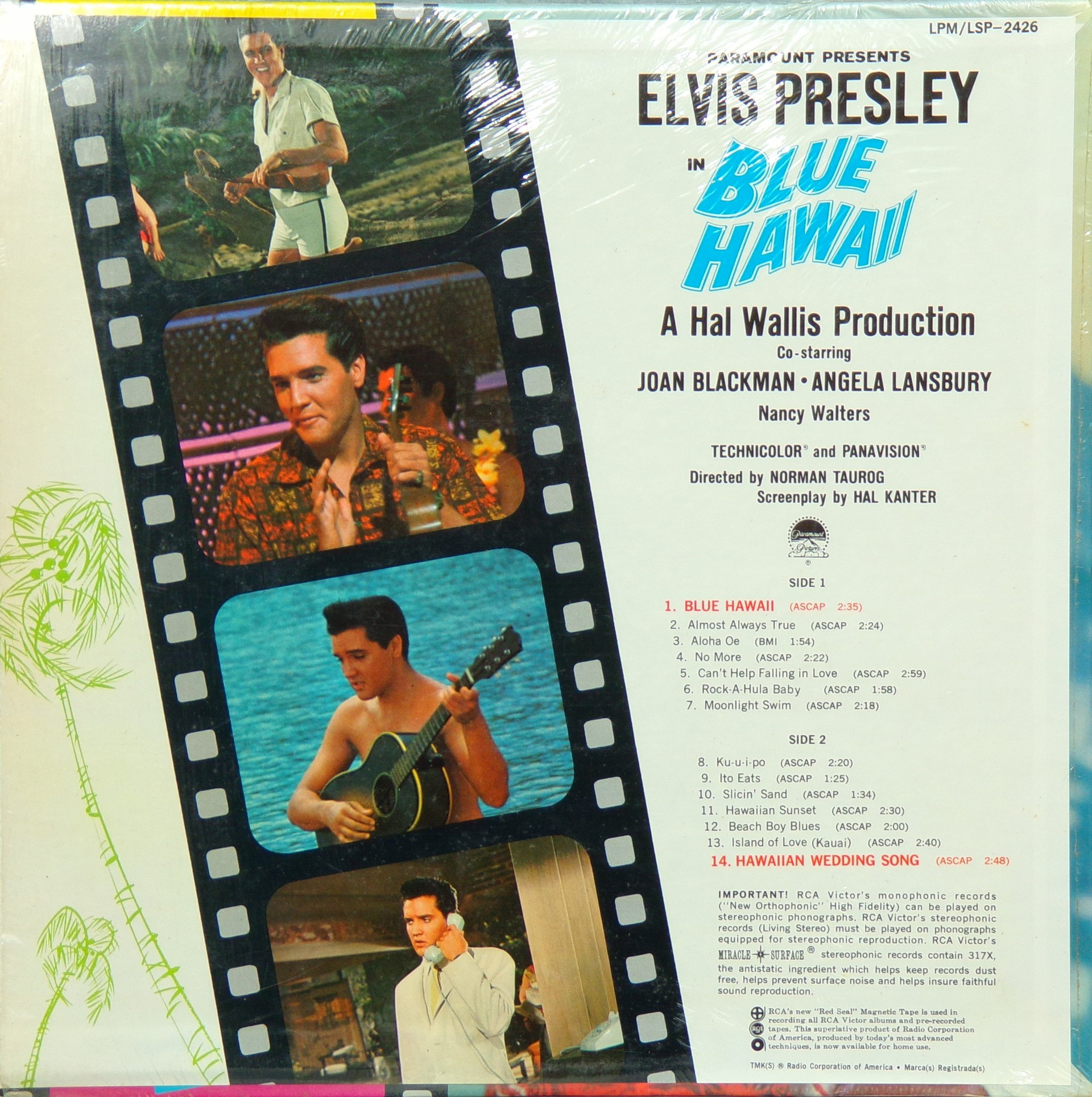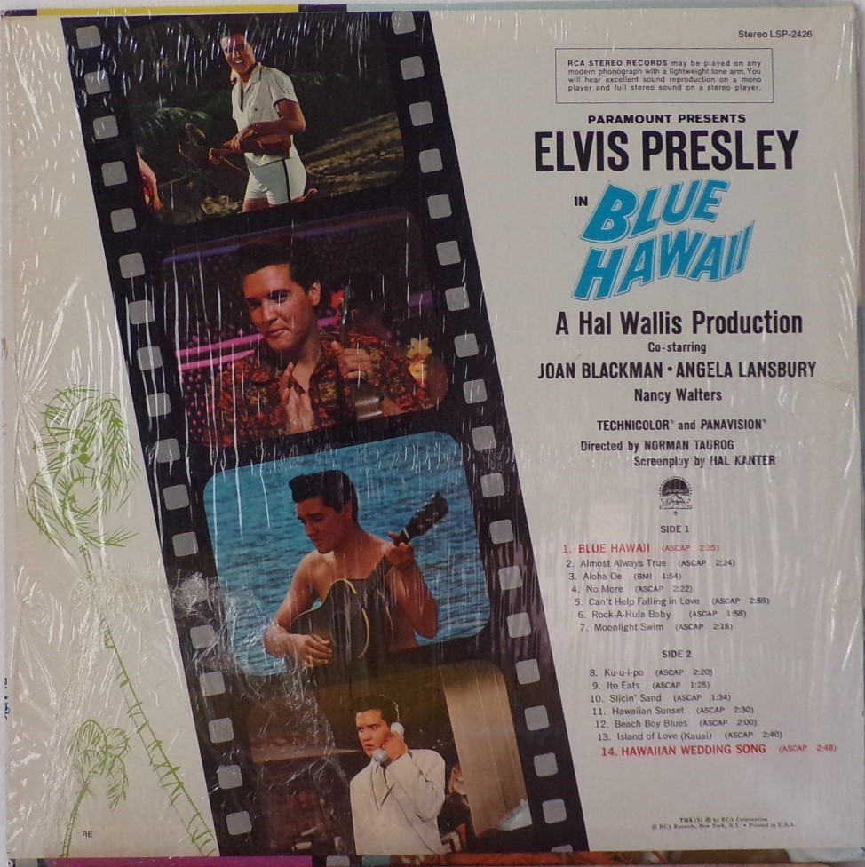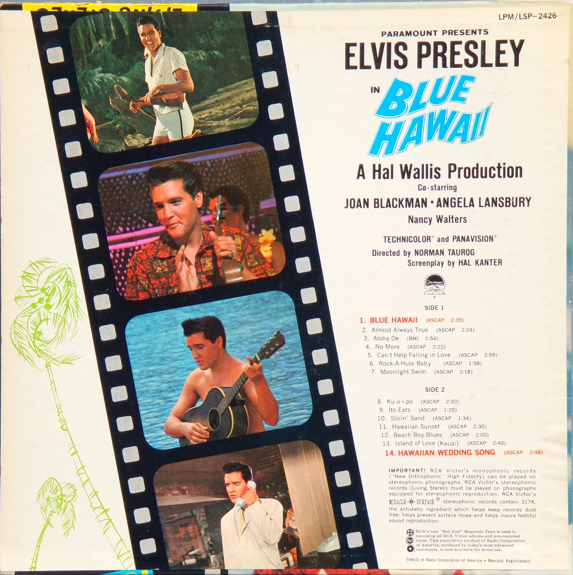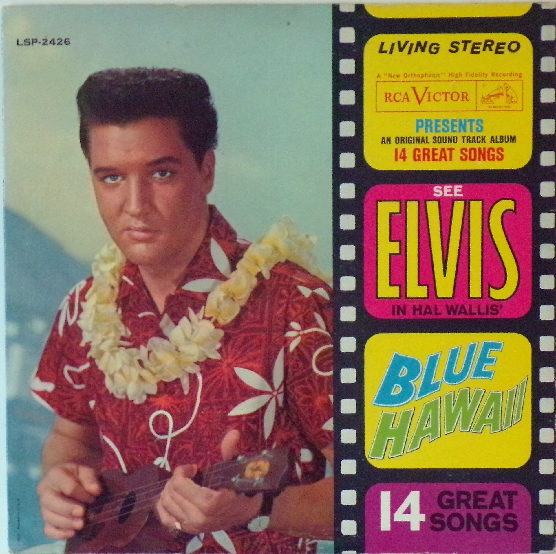 Recorders, Hollywood, March 21, 1961 Blue Hawaii is the fourteenth album by Elvis Presley, released on RCA Victor Records in mono and stereo, LPM/LSP 2426, in October 1961. It is a soundtrack for Presley's film of the same name. Recording sessions took place at Radio Recorders in Hollywood on March 21, 22, and 23, 1961. It spent 20 weeks at the #1 slot and 39 weeks in the Top 10 on the US Top Pop Albums chart. It was certified Gold on 12/21/1961, Platinum and 2x Platinum on 3/27/1992 and 3x Platinum on 7/30/2002 by the RIAA. On the US Top Pop Albums chart Blue Hawaii is the #2 most successful album of the 1960s, second only to West Side Story. RCA and the Colonel had initially planned a schedule of one soundtrack and one popular music release per year for Presley, in addition to the requisite four singles . To coincide with the location of the film, touches of Hawaiian music were included, from instrumentation to the traditional song "Aloha ?Oe." The title song was taken from a similar film Waikiki Wedding starring Bing Crosby in 1937, and "Hawaiian Wedding Song" dates from a 1926 operetta. The songs "Can't Help Falling In Love" and "Rock-A-Hula Baby" were pulled off the album for two sides of a single released the following month. The A-side "Can't Help Falling In Love," which would become the standard closer for an Elvis Presley concert in the 1970s, went to #2 on the Billboard Hot 100, while the b-side charted independently at #23. The Blue Hawaii soundtrack was nominated for a Grammy Award in 1961 in the category of Best Sound Track Album Or Recording Of Original Cast From A Motion Picture Or Television. The success of this soundtrack and its predecessor G. I. Blues, both of which sold in much greater quantity than Presley's two regular releases of the time, Elvis Is Back! and Something for Everybody, set the pace for the rest of the decade. The Colonel and Presley would focus on Elvis' film career, "normal" albums taking a back seat with only six during the 1960s against sixteen full-length soundtrack albums among 27 movies and the comeback special. Five songs from this album appear on the 1995 compendium of soundtrack recordings: the two sides of the single, "Blue Hawaii," Details :Front Cover : Photo of Elvis. Film title to right. Catalogue