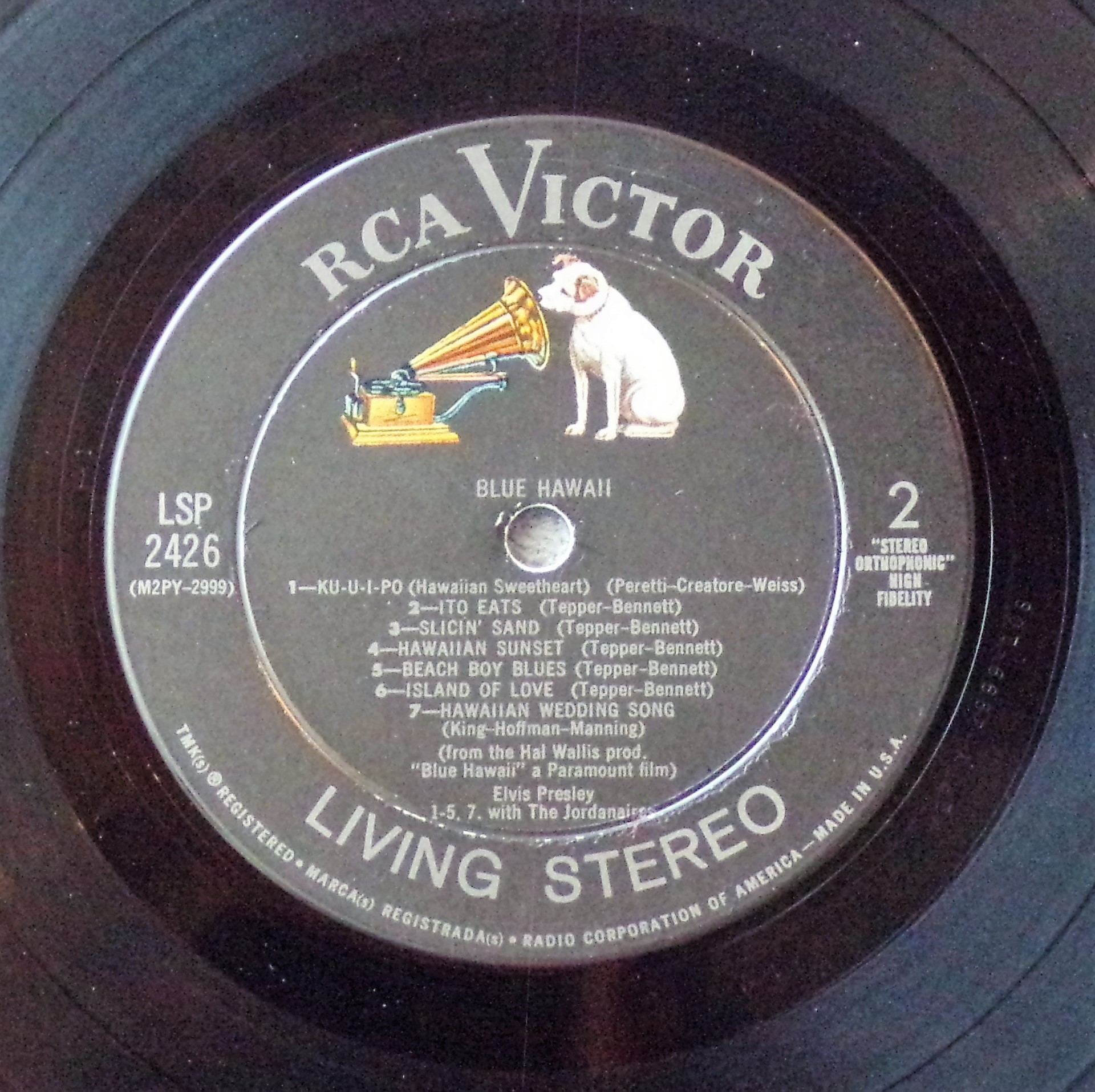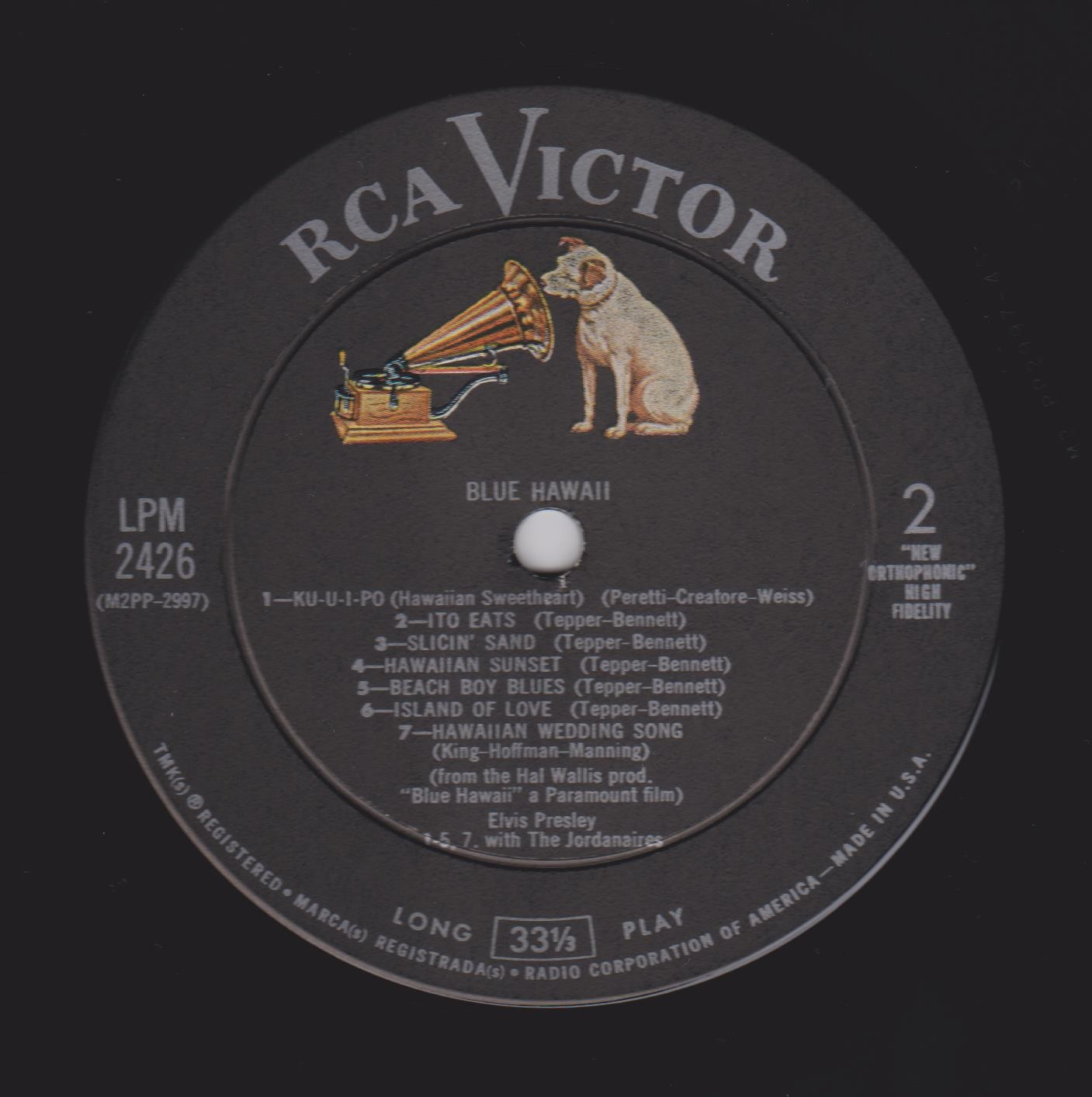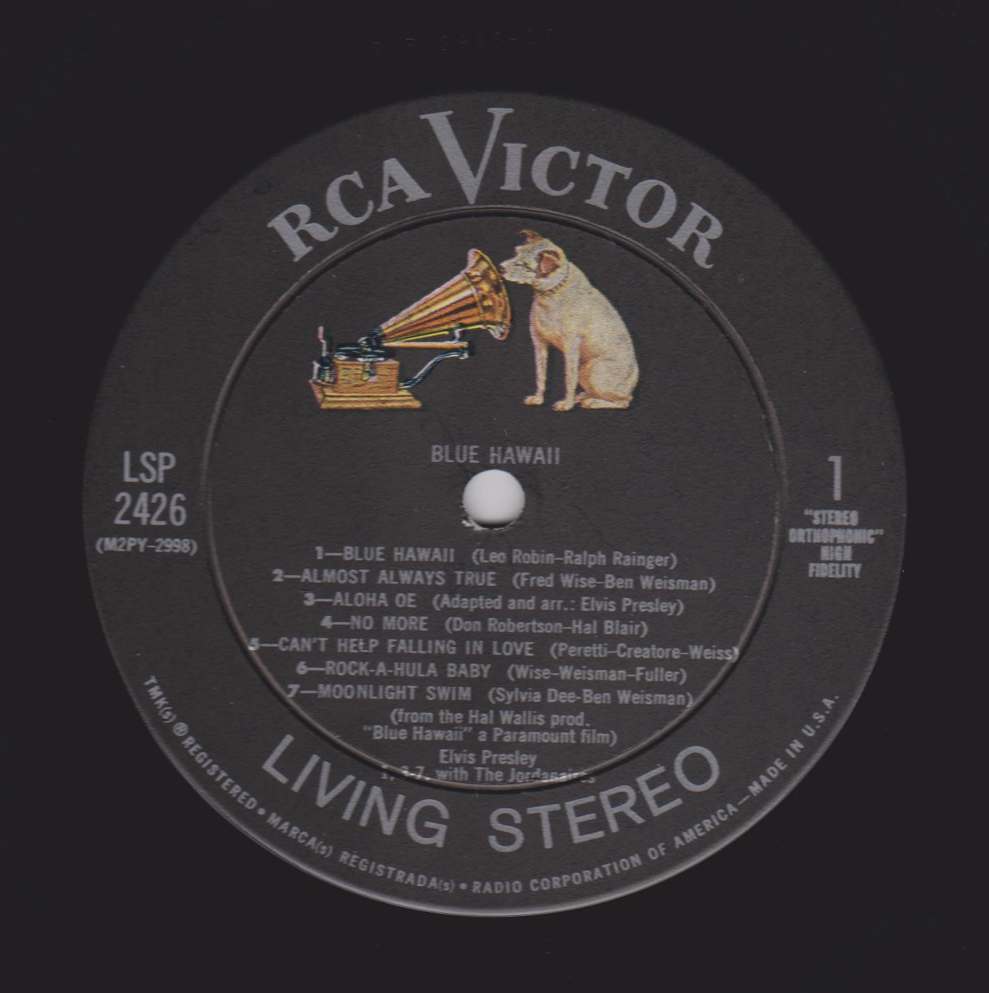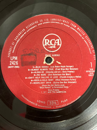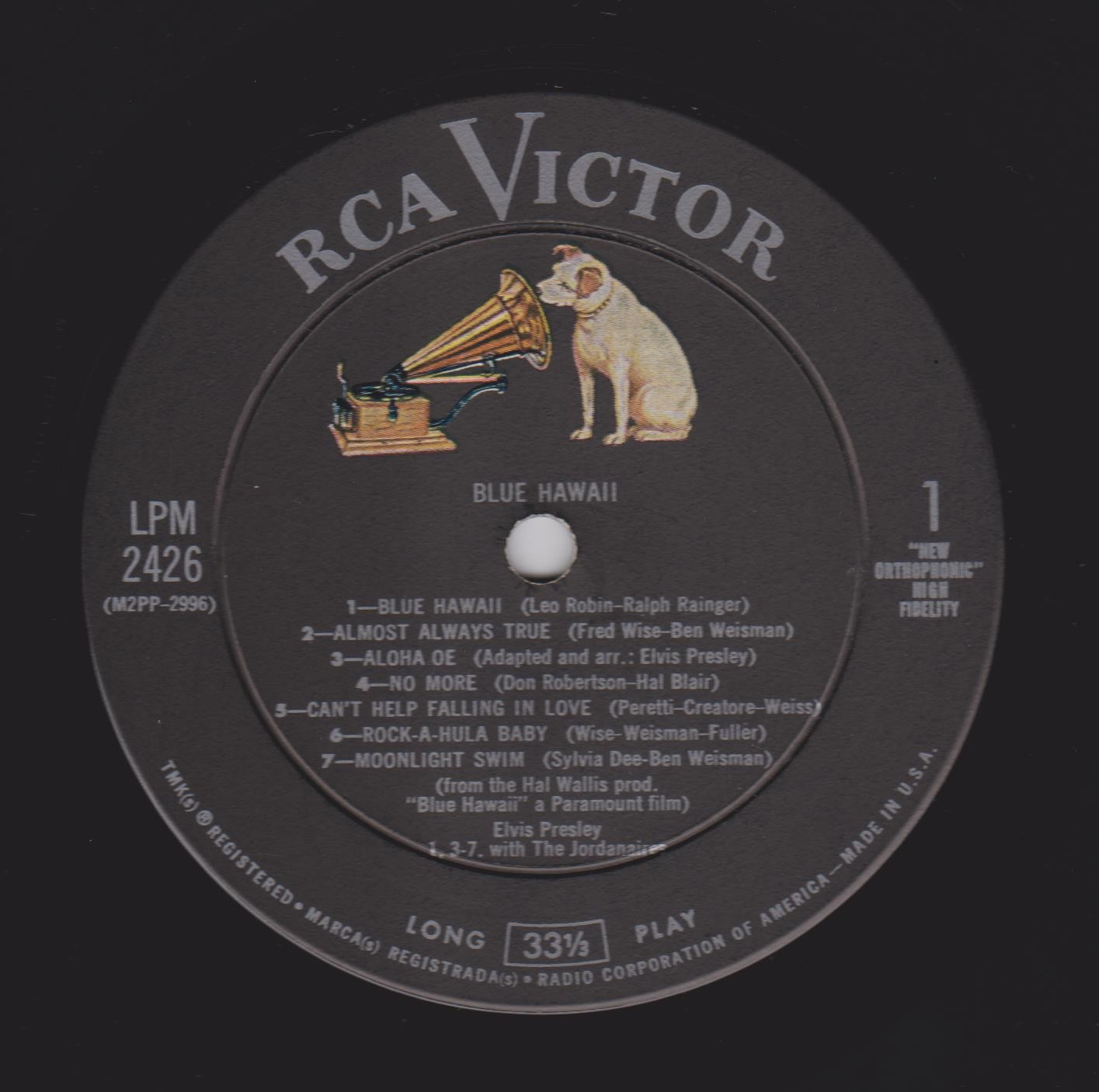 number bottom left. Logo top right. Bottom side left Printed In U.S.A. Rear Cover : 4 Elvis photos from Blue Hawaii. Catalogue number top right LPM/LSP 2426. Label : Black with silver lettering & dog on top. Side 1 : Right side has "New Orthophonic" High Fidelity under the number 1. Long Play at bottom. Side 2 : Right side has "New Orthophonic" High Fidelity under the number 2. Long Play at bottom. Pressing Plant : Indianapolis Matrix Number Side 1 : M2PP - 2996 - 1S B1 (Machine Stamped) Matrix Number Side 2 : M2PP - 2997 - 1S A3 (Machine Stamped) *NOTE* Front cover bottom side left Printed In U.S.A. |