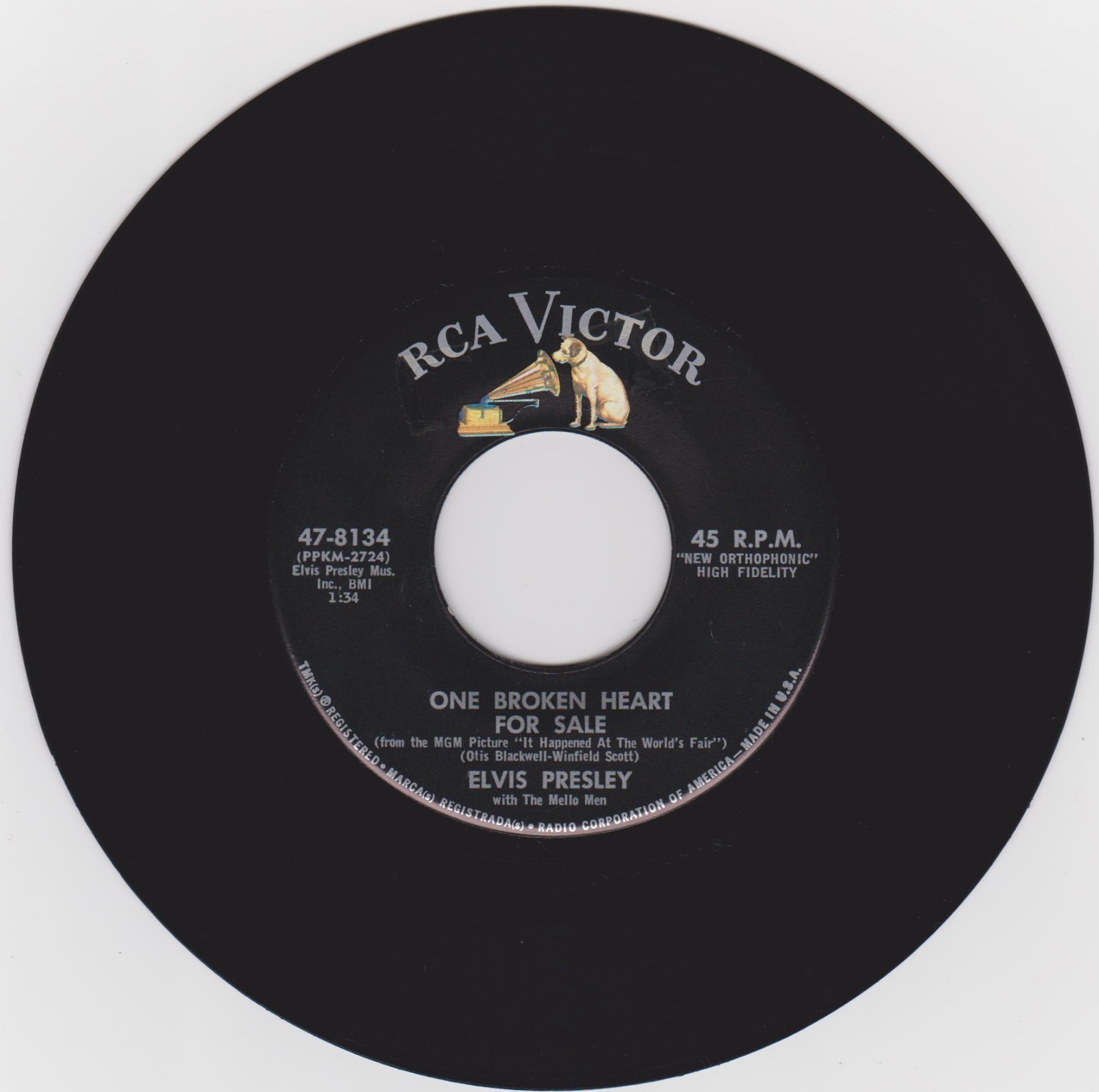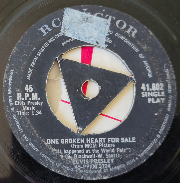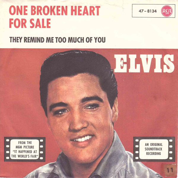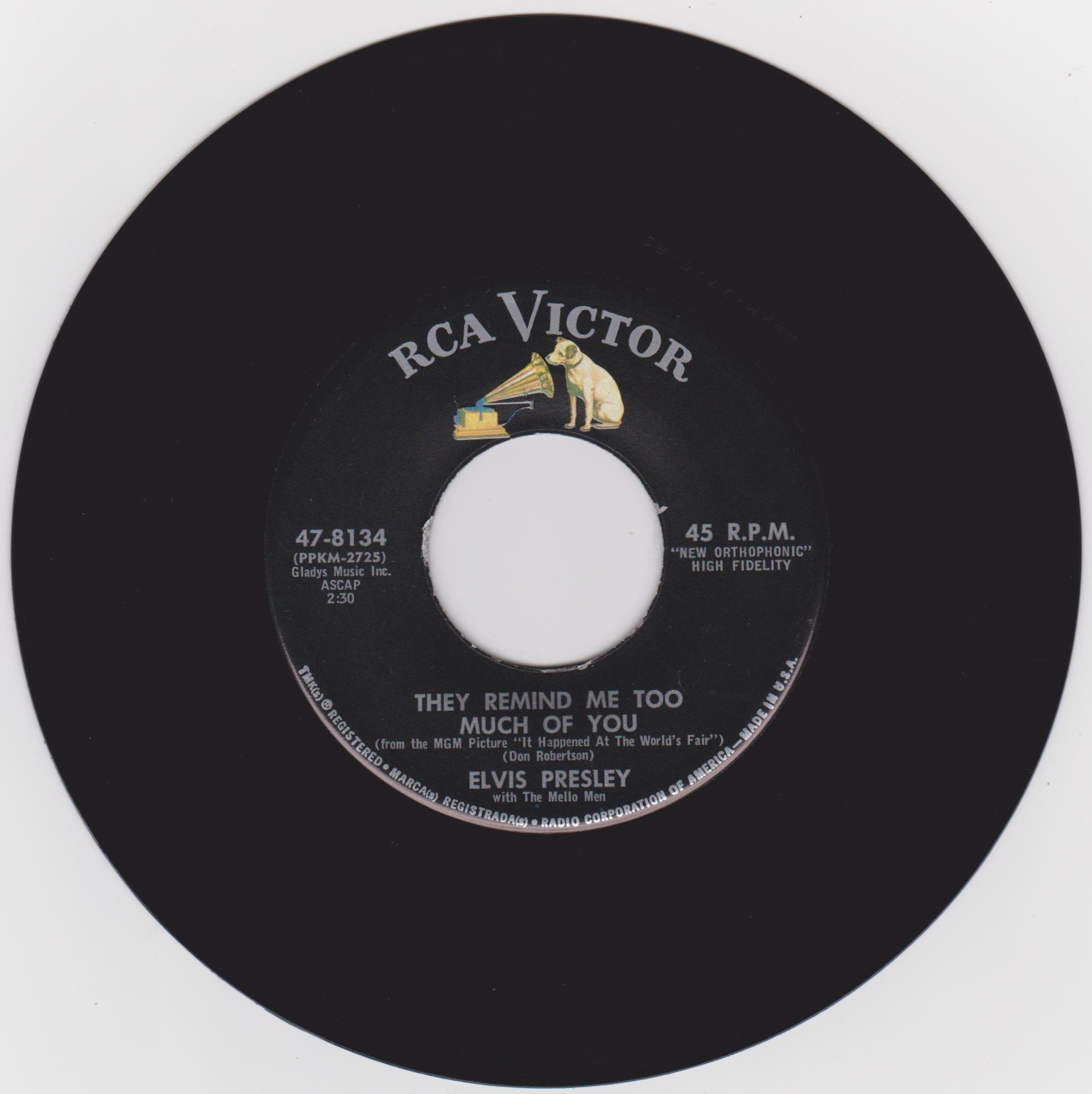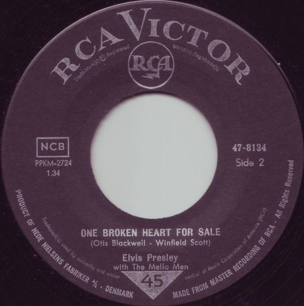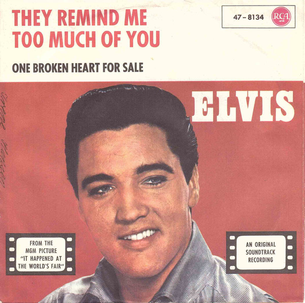 | Label: RCA Victor – 47-8134, RCA – 47-8134 Format: Vinyl, 7", 45 RPM, Single Country: Denmark Released: ??? Made By – Hede Nielsens Fabriker A/S From The MGM picture "It Happened At The World's Fair". This danish edition has "They Remind Me Too Much Of You" as Side 1 and "One Broken Heart For Sale" as Side 2, where as other editions of 47-8134 it is the other way around. Label : RCA on the sleeve, RCA Victor on the labels. Matrix / Runout (Side A Label): PPKM-2725 |