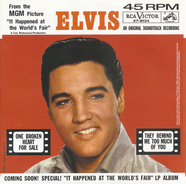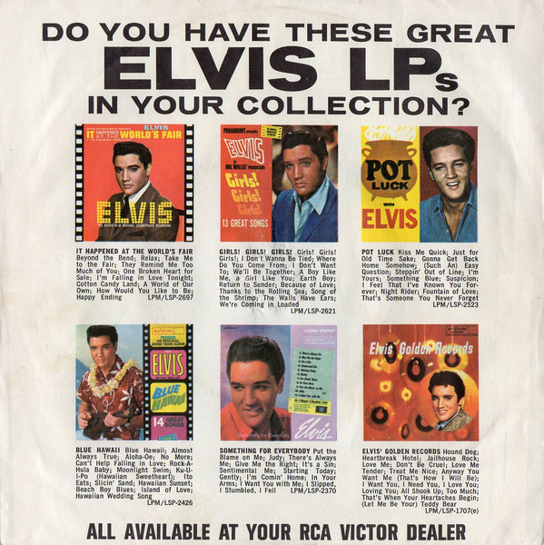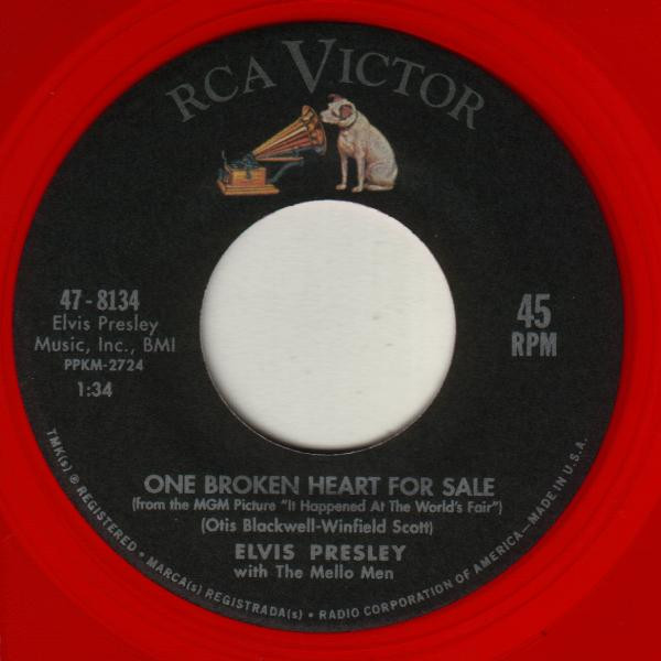 | Label: RCA Victor – 47-8134, Collectables – 47-8134 Format: Vinyl, 7", 45 RPM, Single, Reissue, Red Vinyl Country: US Released: 2001 2001 re-release in red vinyl with a picture sleeve From The MGM picture "It Happened At The World's Fair" Matrix / Runout (Side A): DRE13219A |