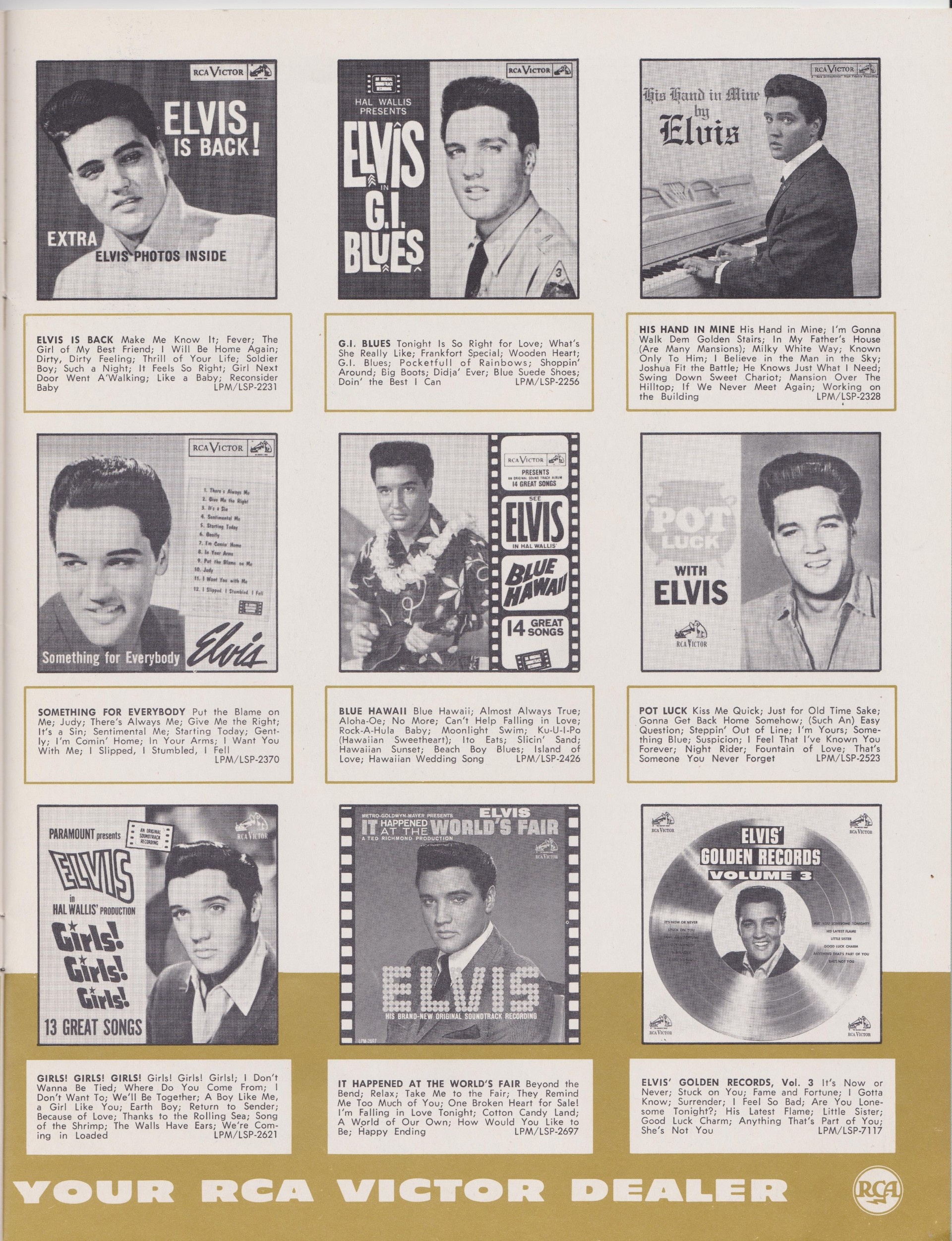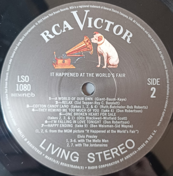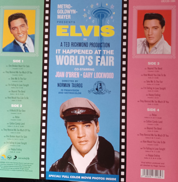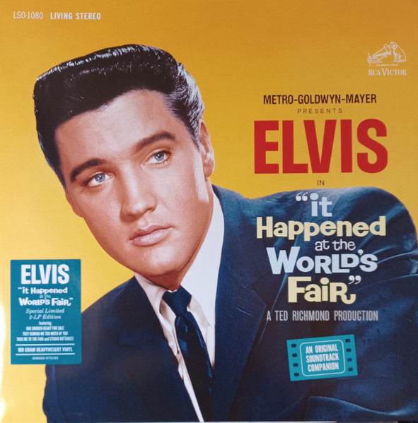August 30, 1962 Brief History : It Happened at the World's Fair is the seventeenth album by Elvis Presley, released on RCA Victor Records in mono and stereo, LPM/LSP 2697, in April 1963. Recording sessions took place at Radio Recorders in Hollywood on August 30 and September 22, 1962. It peaked at #4 on the Billboard Top Pop Albums chart. Initially booked for August 28 and 29, sessions were delayed as Presley had taken ill, and only two numbers were completed satisfactorily on the first night of August 30. Ten songs were tackled for the soundtrack, the standouts being two written by one of Presley's favorite songwriters, Don Robertson taking an active part in the sessions by playing keyboards, and one by the team that had written the #2 hit single "Return to Sender" of the previous year, Otis Blackwell and Winfield Scott. All three songs, "I'm Falling In Love Tonight," "They Remind Me Too Much of You," and "One Broken Heart for Sale," would be included on the 1995 compilation of soundtrack highlights. "One Broken Heart for Sale" and "They Remind Me Too Much of You" would be released ahead of time on January 29 as a single to promote both the album and the film. "Broken Heart" just missed the top ten, peaking at #11 on the Billboard Hot 100, with the b-side charting independently at #53. Truncated with a verse excised to a very short length of 1:35, "Broken Heart" was the first RCA single of Presley's career that did not make the top five, excluding the bizarre case of "Shake Rattle and Roll" which did not chart at all after being released on August 31, 1956, simultaneously with the Presley debut album divided up into six singles. Front Cover : Photo of Elvis. Title on top. Catalogue
