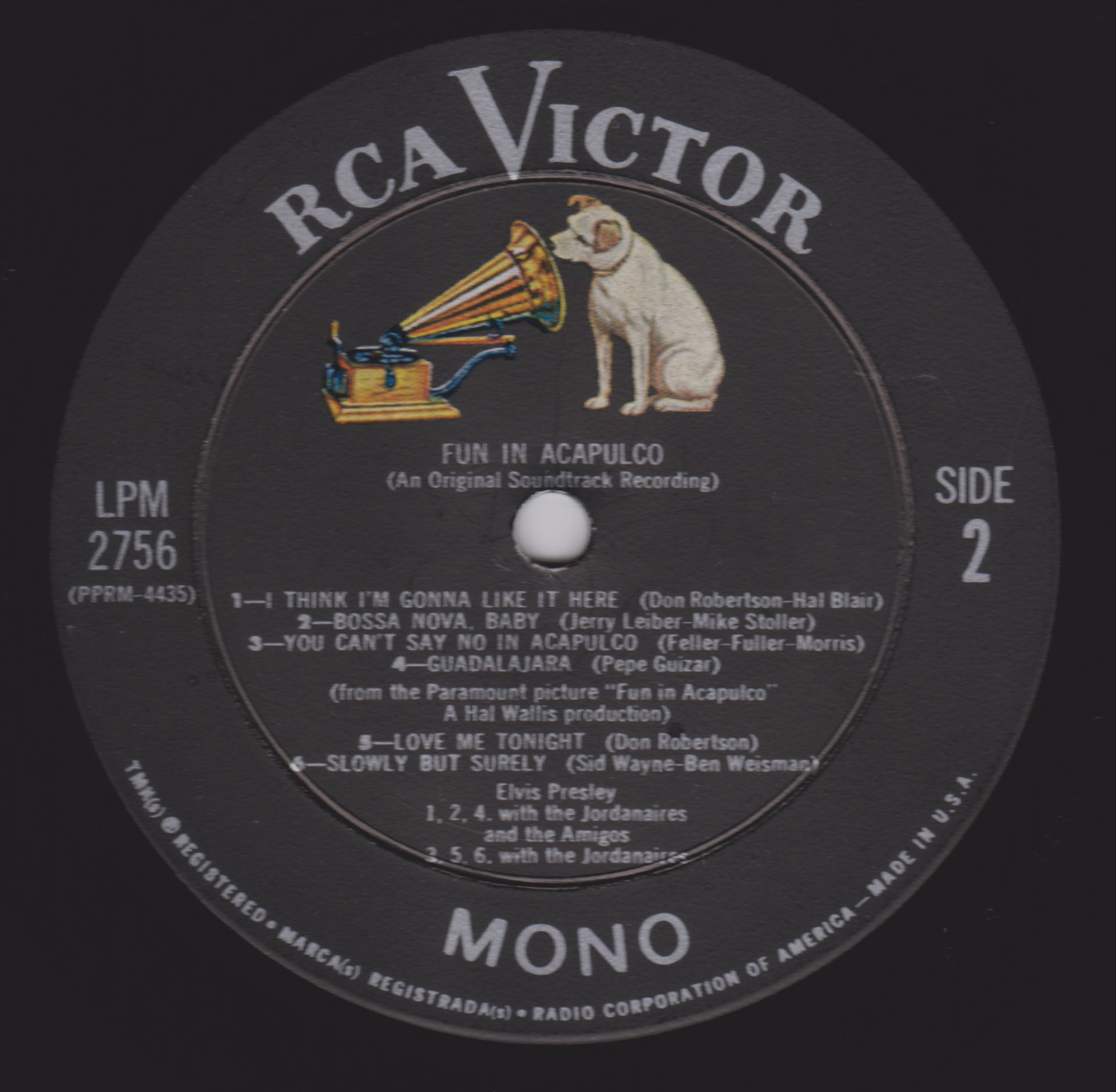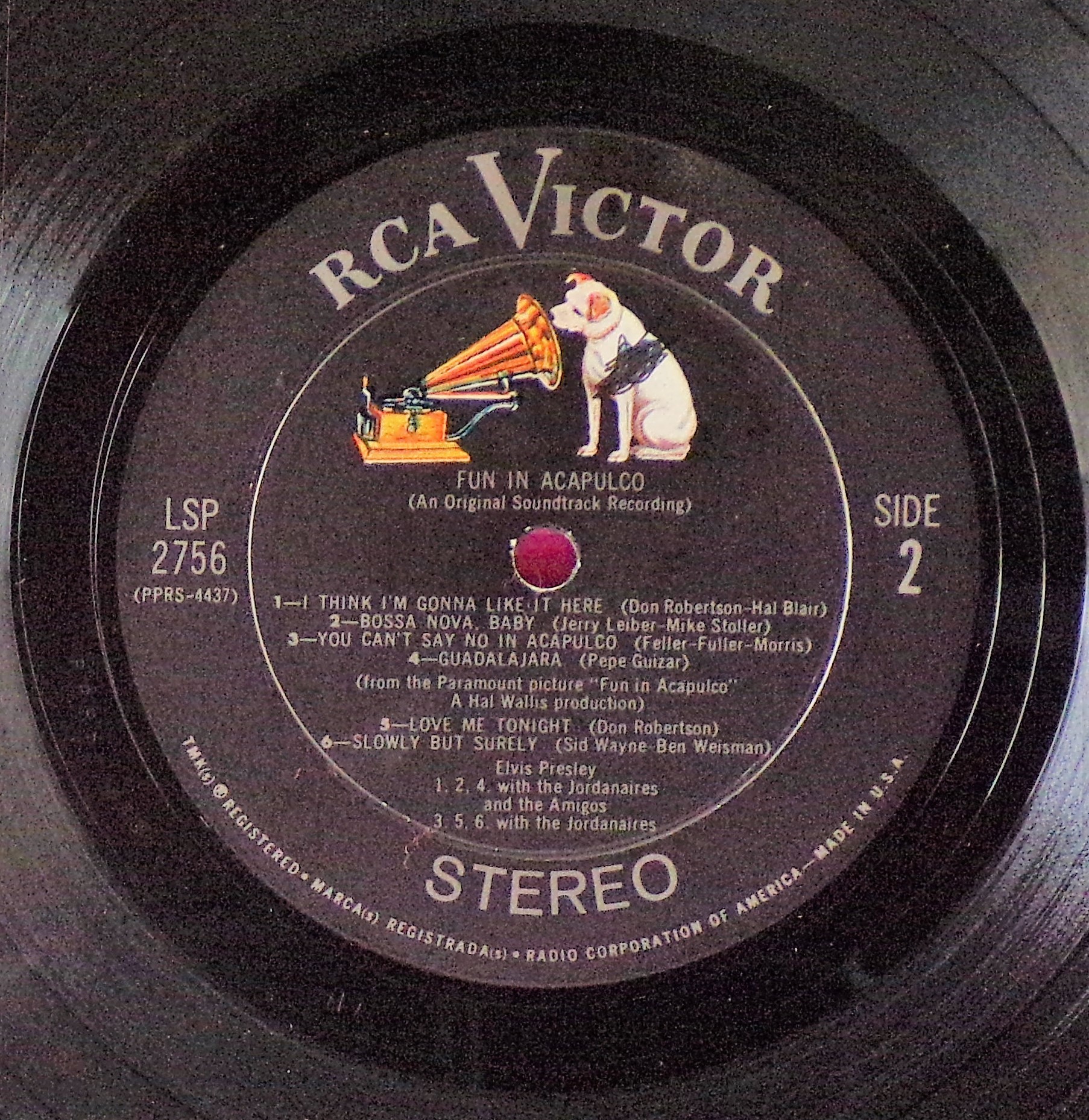 Hollywood, January 22, 1963 Brief History : Fun in Acapulco is the nineteenth album by Elvis Presley, released on RCA Victor Records in mono and stereo, LPM/LSP 2756, in November 1963 - the November 1 date is disputed. Recording sessions took place at Radio Recorders in Hollywood on January 22 and 23, 1963, and at RCA Studio B in Nashville, Tennessee, on May 26 and 27, 1963. It peaked at #3 on the Top Pop Albums chart. The album, along with the accompanying film, would be Presley's last release before the arrival of Beatlemania. The third of his tropical travelogue films for Paramount Pictures after Blue Hawaii and Girls! Girls! Girls! finds Elvis frolicing south of the border. The standard stable of songwriters for Presley delivered songs to match, with titles like "Marguerita," "El Toro," "You Can't Say No In Acapulco," and "The Bullfighter Was A Lady." Included as well was the old standard "Guadalajara" by Pepe Guízar from the 1930s. With the change from the normal routine, and with the addition of trumpet players Rudolph Loera and Anthony Terran, Presley engaged the material with greater enthusiasm than on recent soundtrack outings. Four of these songs would be included on the 1995 compilation of soundtrack highlights: the title track, "Mexico," "Marguerita," and the song released as the lead single, "Bossa Nova Baby." "Bossa Nova Baby" arrived in stores one month prior to the soundtrack, coupled with the track "Witchcraft" by rhythm and blues songwriter and arranger Dave Bartholomew and a hit for The Spiders in 1956. The fact that the bossa nova craze of the 1960s was a Brazilian phenomenon rather than a Mexican one mattered little, as the single peaked at #8 on the Billboard Hot 100. Compensating for the skimpy ten-track It Happened at the World's Fair album, the Colonel insisted on making Fun in Acapulco a good value. Two additional tracks, "Love Me Tonight" and "Slowly But Surely" were pulled from the aborted album sessions of May, 1963, and added here to bring the running order up to thirteen tracks. Details : *NOTE* Top of label states "A Hall Wallis Production - An Original Soundtrack Recording" under Fun In Acapulco in capitals. On labels Right side has "New Orthophonic" High Fidelity under the numbers 1 & 2. Jordanaires & Amigos on one line both sides of label. |