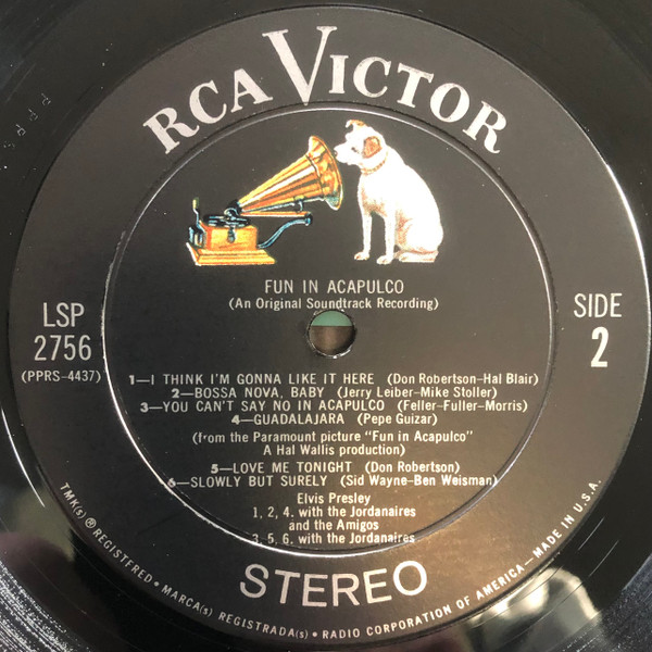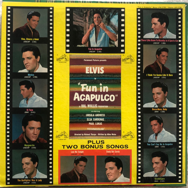 IN ACAPULCO (LP) (US) RCA LSP / LPM 2756 Released: November 15, 1963 Side 1 Fun In Acapulco ** Vino, Dinero Y Amor * Mexico * El Toro ** Marguerita * Bullfighter Was A Lady * No Room To Rhumba In A Sports Car ** Side 2 I Think I'm Gonna Like It Here * Bossa Nova Baby You Can't Say No In Acapulco ** Guadalajara ** 2 Bonus Songs (Not In Movie) Love Me Tonight *** Slowly But Surely **** * Recorded: Radio Recorders,