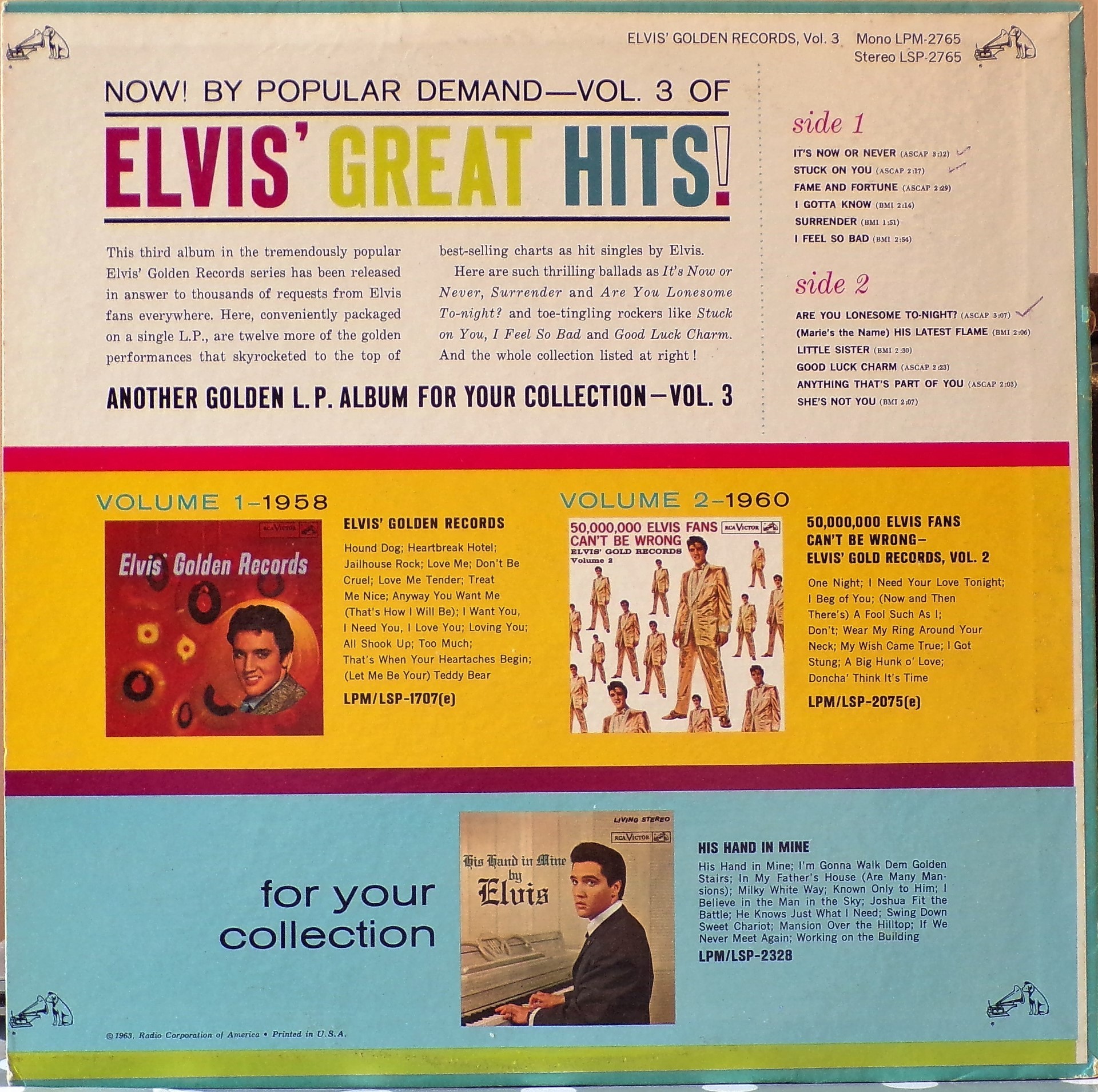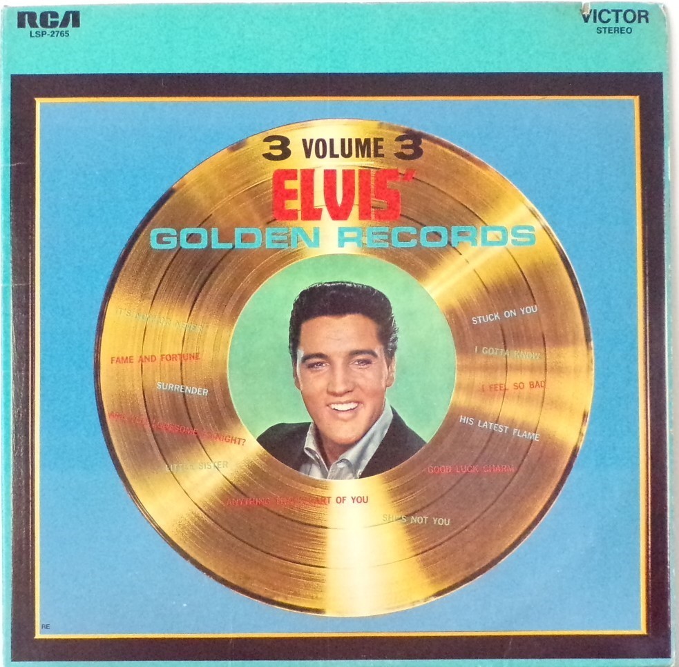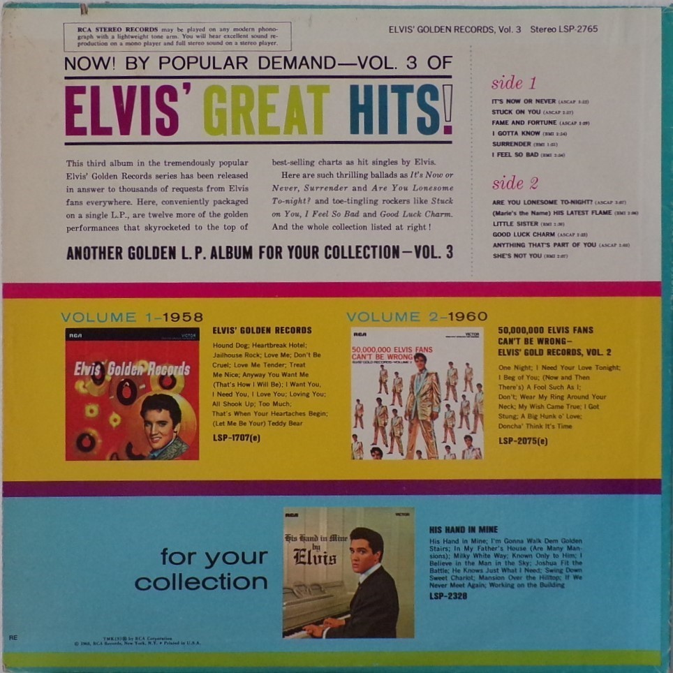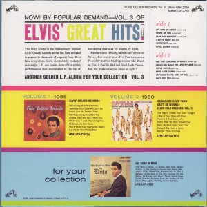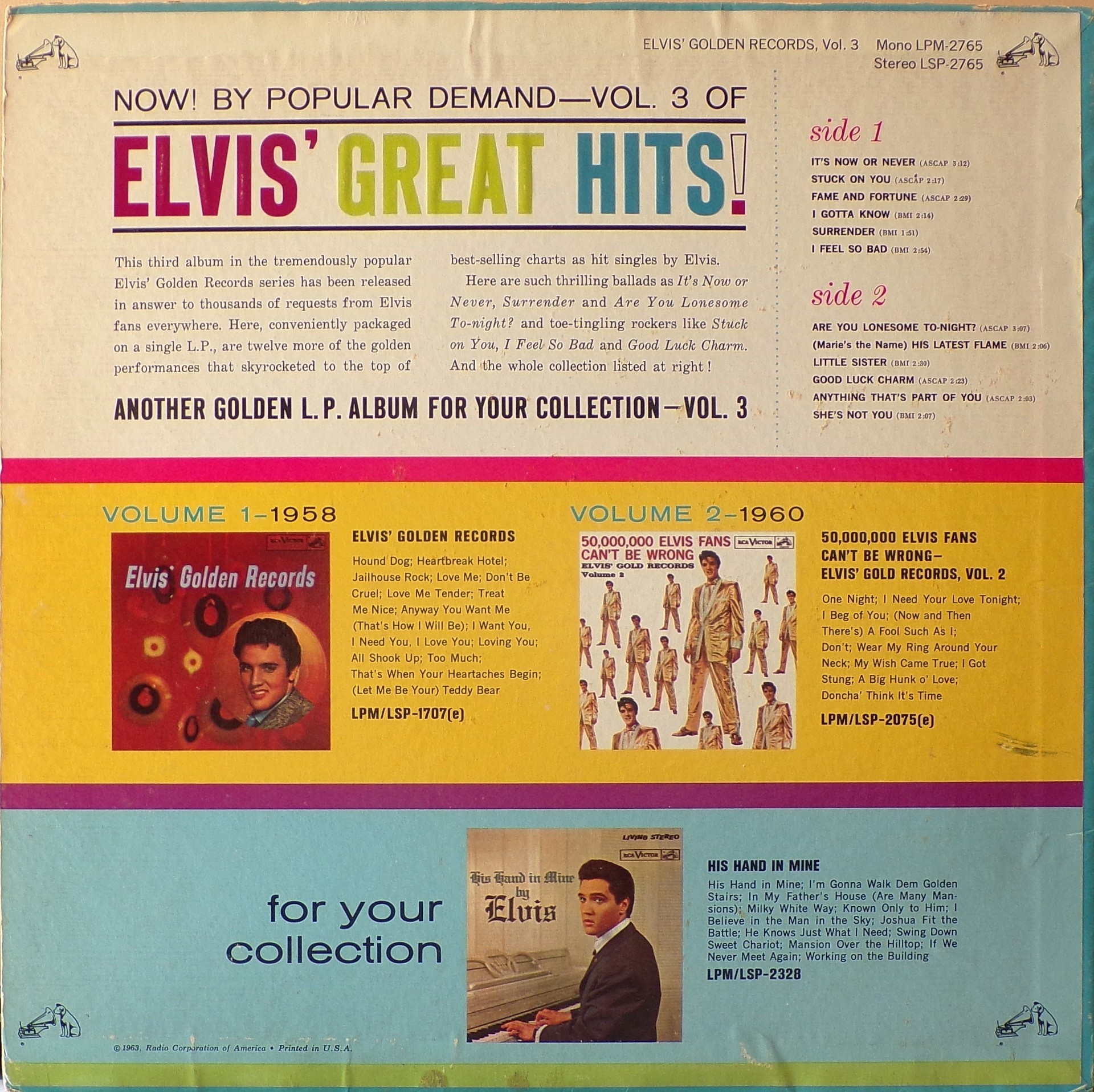 GOLDEN RECORDS VOLUME 3 (LP) Catalogue Number : LPM - 2765 Brief History : Elvis' Golden Records Volume 3 is a greatest hits album by American rock and roll icon Elvis Presley, released by RCA Victor, RCA Victor LPM-2765, on August 11, 1963. The record was the third volume of a five volume collection. It is a compilation of hit singles released in 1960, 1961, and 1962. The album was originally released as a mono and stereo LP record and was reissued several times. It was certified Gold on 11/1/1966 and Platinum on 3/27/1992 by the R.I.A.A. Colonel Parker envisioned a marketing strategy of alternating soundtrack albums with independent studio recordings, accompanied by singles. By mid-1963, Presley's studio albums had struggled while the soundtrack albums had all done brisk business. Sessions in late May had failed to produce material cohesive enough for a regular album, those tracks surfacing on singles and pell-mell on soundtracks and the Elvis for Everyone compilation. The immediate solution was another compilation of hit singles, the sales numbers proving the success of this interim strategy. Golden Records Volume 3 comprises eight Top Five A-sides along with four b-sides which also made the Top 40, "Fame and Fortune," "I Gotta Know" "Little Sister," and "Anything That's Part of You." Five A-Sides, "Stuck on You," "It's Now or Never," Are You Lonesome Tonight?," "Surrender," and "Good Luck Charm" went to #1. "It's Now or Never" had been adapted from the 1898 Neapolitan song "O Sole Mio," and "Are You Lonesome Tonight," a ballad from 1926, had been a rare request to Elvis from the Colonel for his wife. As with the other titles in the series, all singles in this compilation are certified by the RIAA as attaining gold status with sales of at least 500,000 copies. Original recordings produced by Steve Sholes, Joseph Lilley, Chet Atkins, Urban Thielmann, Jeff Alexander, and Hans Salter. Details : *NOTE* The below 16 page full colour folio with a giant size pin up inside was given away at record stores with this release. On a further note in photo 6 (page 5 - last photo listed here) of the folio they listed Elvis' Golden Records Volume 3 as LPM / LSP 7117 which is incorrect. In photo 16 (page 15) they have listed it incorrectly also. The folio was released with 2 corrections after this. This folio also came with a giant size poster stapled inside. |