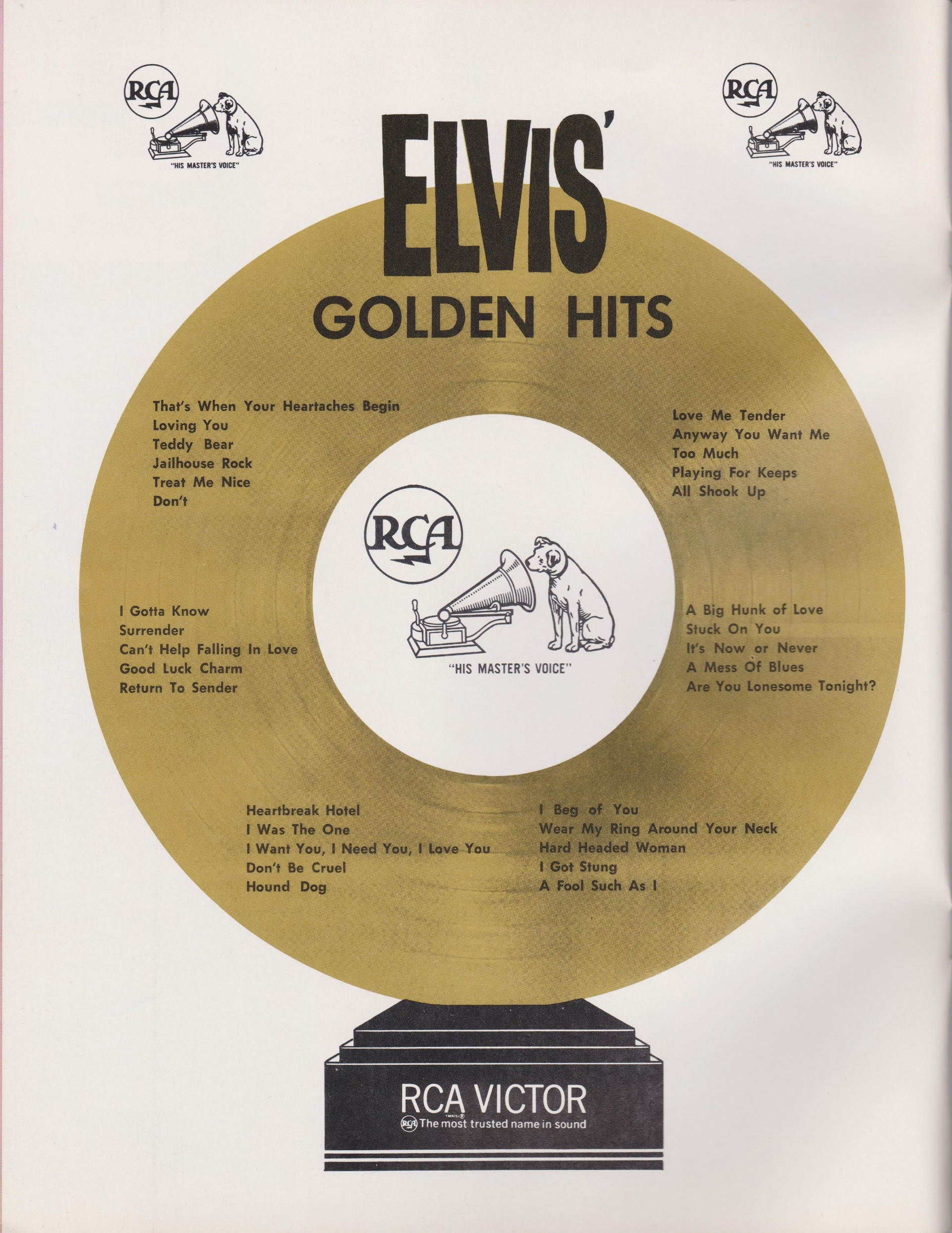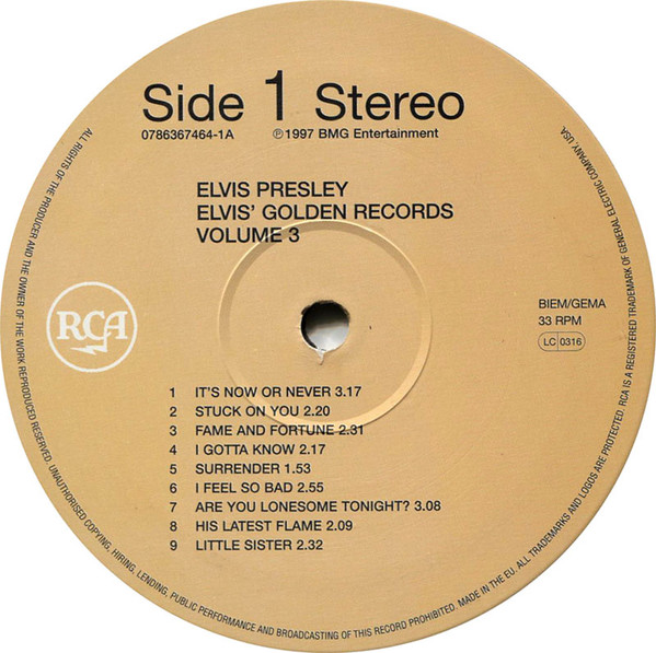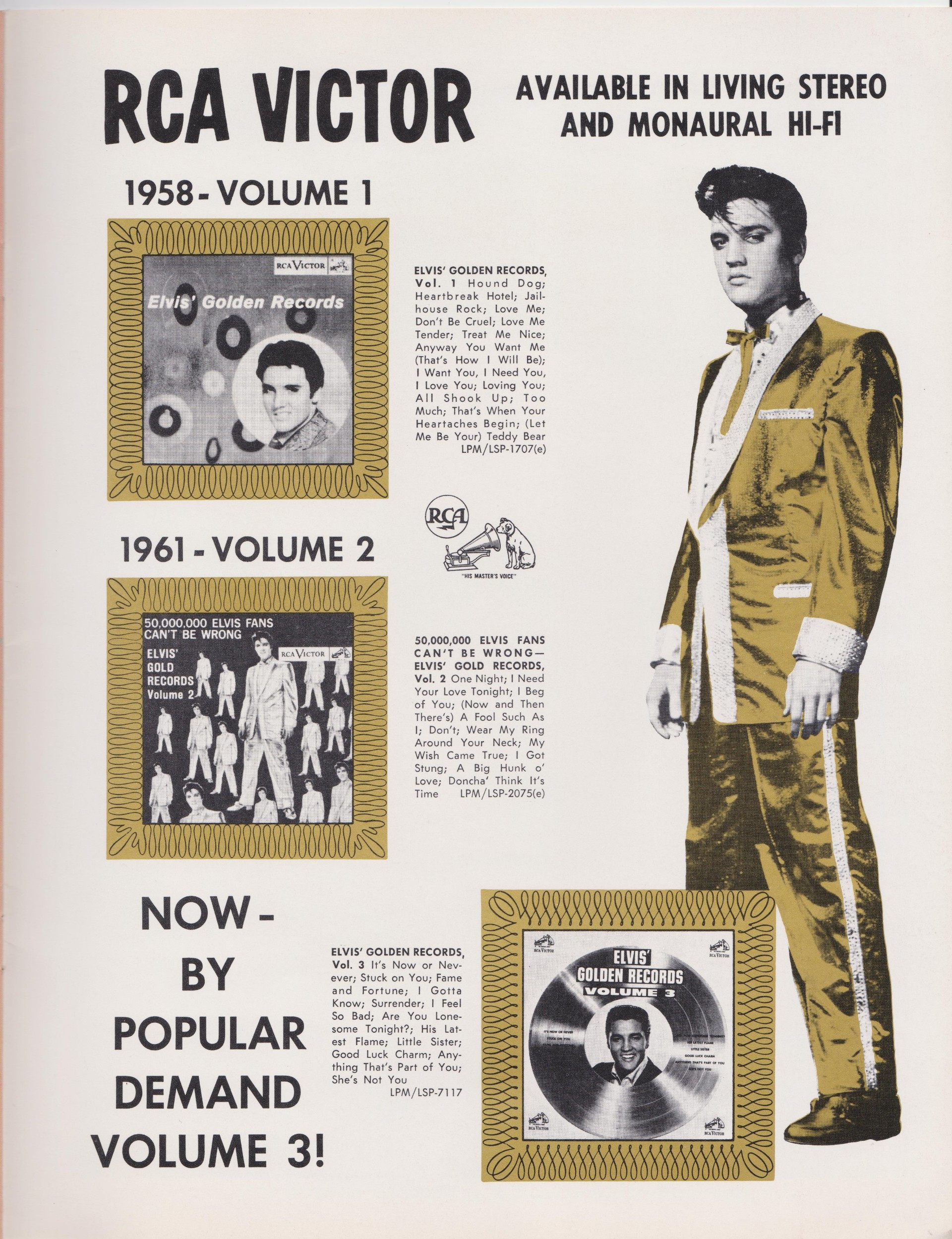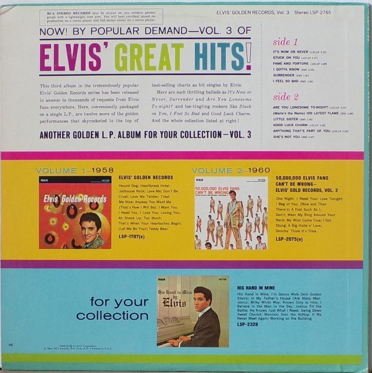 GOLDEN RECORDS VOLUME 3 (LP) Catalogue Number : LPM - 2765 Brief History : Elvis' Golden Records Volume 3 is a greatest hits album by American rock and roll icon Elvis Presley, released by RCA Victor, RCA Victor LPM-2765, on August 11, 1963. The record was the third volume of a five volume collection. It is a compilation of hit singles released in 1960, 1961, and 1962. The album was originally released as a mono and stereo LP record and was reissued several times. It was certified Gold on 11/1/1966 and Platinum on 3/27/1992 by the R.I.A.A. Colonel Parker envisioned a marketing strategy of alternating soundtrack albums with independent studio recordings, accompanied by singles. By mid-1963, Presley's studio albums had struggled while the soundtrack albums had all done brisk business. Sessions in late May had failed to produce material cohesive enough for a regular album, those tracks surfacing on singles and pell-mell on soundtracks and the Elvis for Everyone compilation. The immediate solution was another compilation of hit singles, the sales numbers proving the success of this interim strategy. Golden Records Volume 3 comprises eight Top Five A-sides along with four b-sides which also made the Top 40, "Fame and Fortune," "I Gotta Know" "Little Sister," and "Anything That's Part of You." Five A-Sides, "Stuck on You," "It's Now or Never," Are You Lonesome Tonight?," "Surrender," and "Good Luck Charm" went to #1. "It's Now or Never" had been adapted from the 1898 Neapolitan song "O Sole Mio," and "Are You Lonesome Tonight," a ballad from 1926, had been a rare request to Elvis from the Colonel for his wife. As with the other titles in the series, all singles in this compilation are certified by the RIAA as attaining gold status with sales of at least 500,000 copies. Original recordings produced by Steve Sholes, Joseph Lilley, Chet Atkins, Urban Thielmann, Jeff Alexander, and Hans Salter. Details : *NOTE* The below 16 page full colour folio with a giant size pin up inside was given away at record stores with this release. On a further note in photo 6 (page 5 - last photo listed here) of the folio they listed Elvis' Golden Records Volume 3 as LPM / LSP 7117 which is incorrect. In photo 16 (page 15) they have listed it incorrectly also. The folio was released with 2 corrections after this. This folio also came with a giant size poster stapled inside. |