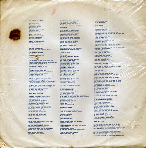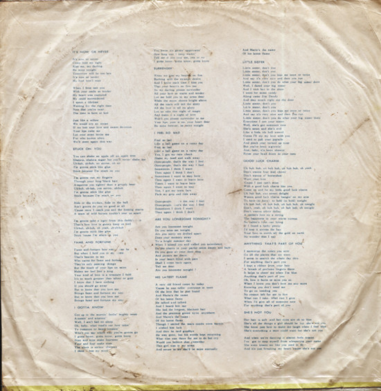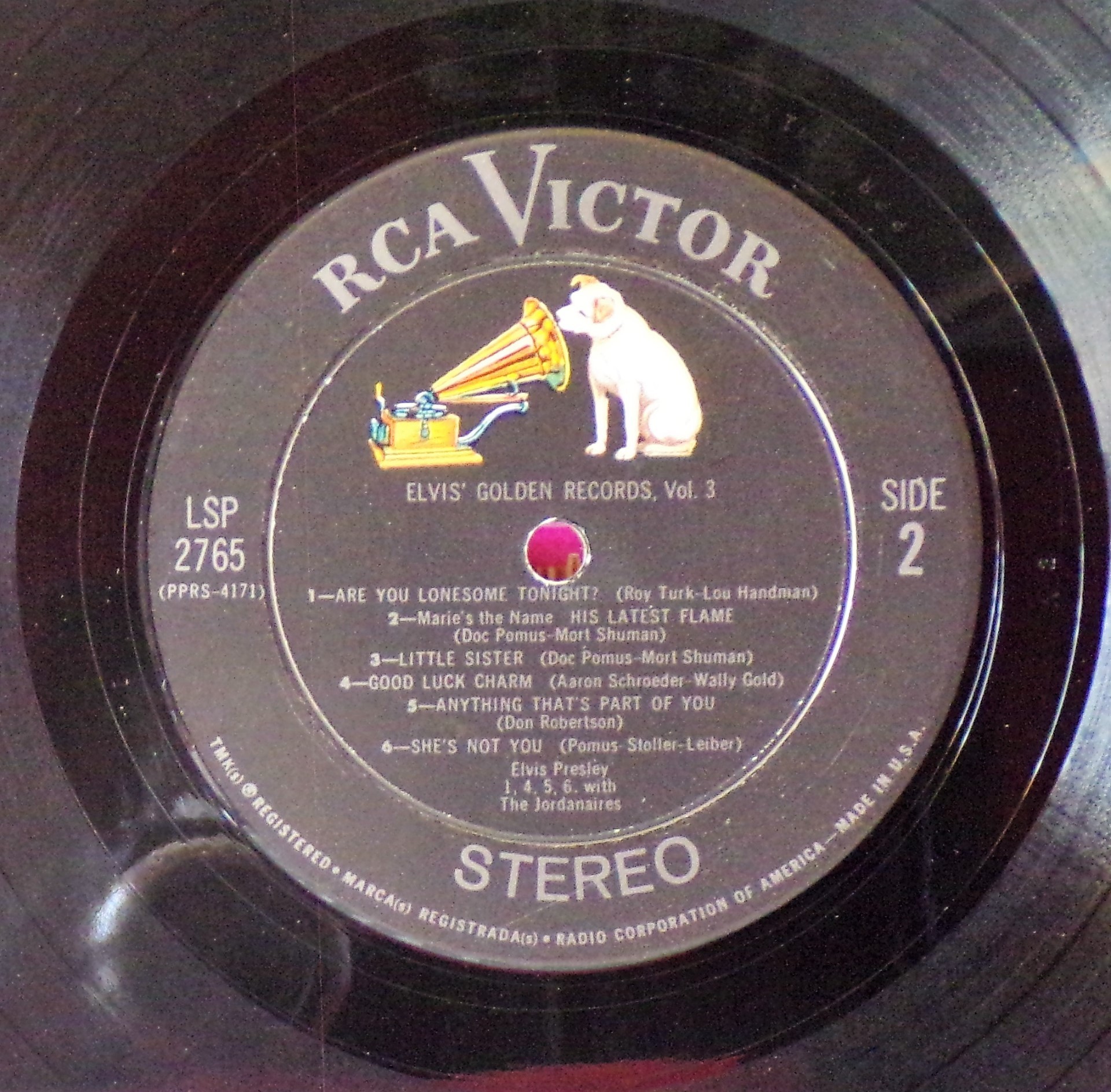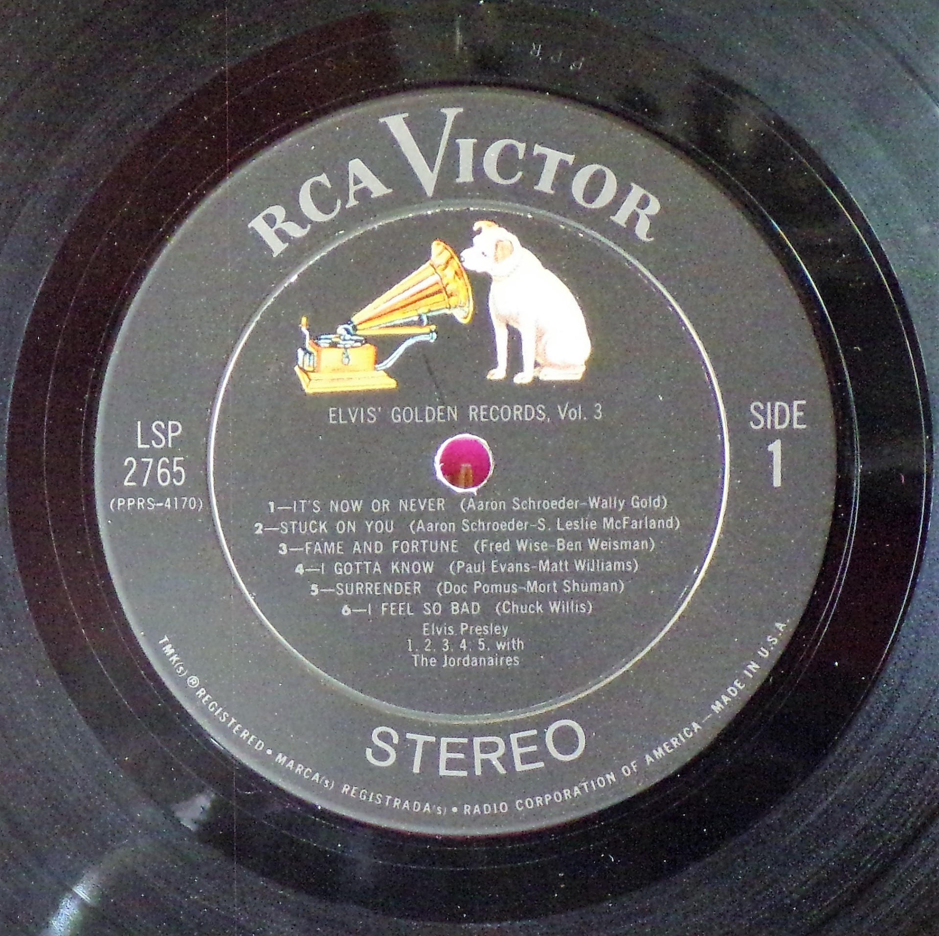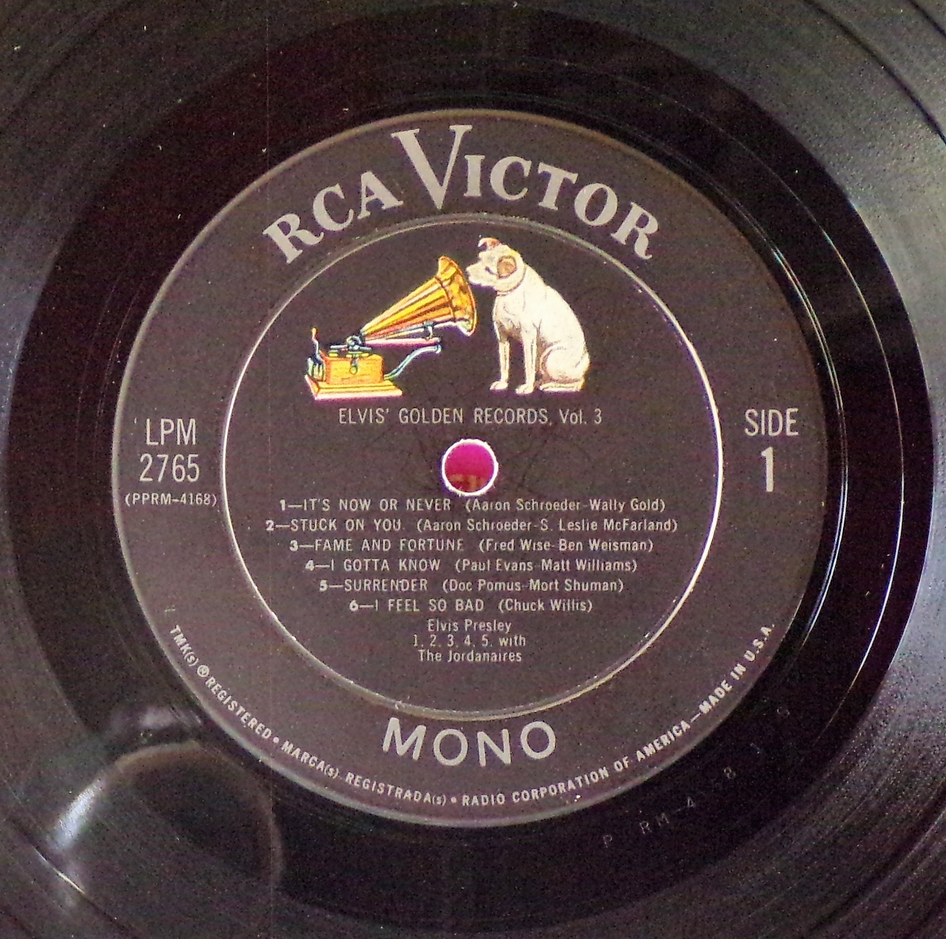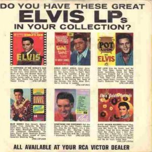 | Details : Catalogue Number : LPM 2697 Front Cover : Photo of Elvis. Title on top. Catalogue number bottom left. Logo top right below album title. Rear Cover : Catalogue number top right LPM/LSP 2697 below RCA Logo. Printed in U.S.A. bottom centre. Label : Black with silver lettering & dog on top. Side 1 : Right side has "New Orthophonic" High Fidelity under the number 1. Long Play at bottom. Side 2 : Right side has "New Orthophonic" High Fidelity under the number 2. Long Play at bottom. Pressing Plant : Hollywood Matrix Number Side 1 : PPRM - 2727 - 6S B (Machine Stamped) Matrix Number Side 2 : PPRM - 2728 - 6S B (Machine Stamped) *NOTE* No photo. MGM statement on vinyl labels on 1 line. Label font light grey. Elvis Presley on bottom of labels large font. |