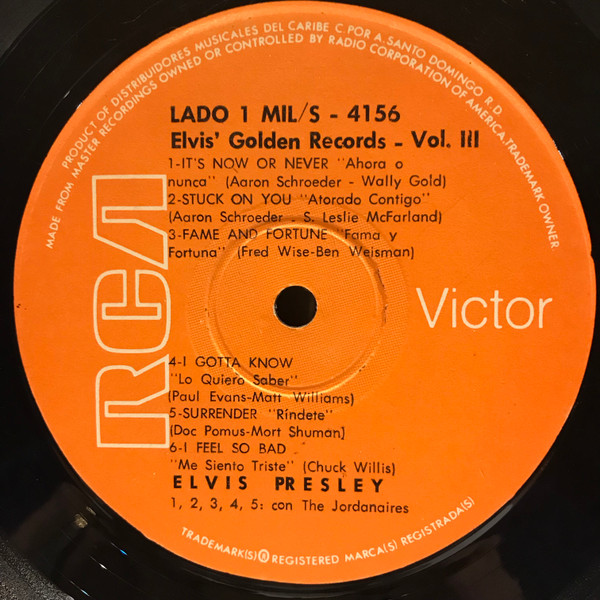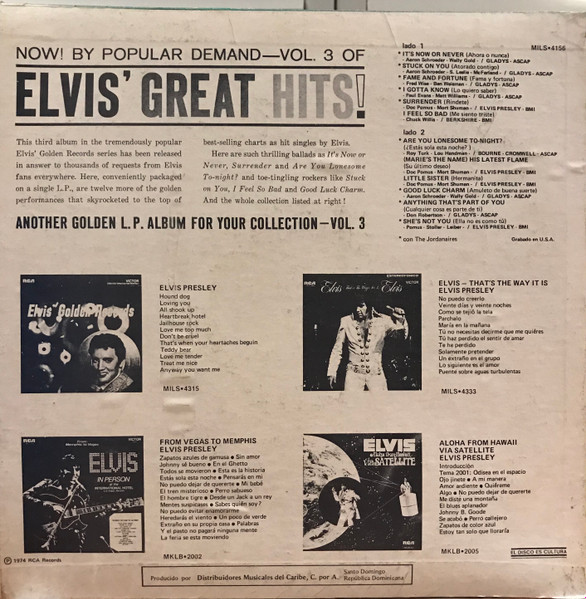 | Label: RCA Victor – MILS-4156 Format: Vinyl, LP, Compilation, Reissue, Stereo Country: Dominican Republic Released: 1974 Backing Vocals [Con] – The Jordanaires (tracks: A1 to A5, B1, B4 to B6) LADO 1 MIL/S- 4156 on Labels A and B and Album Cover |