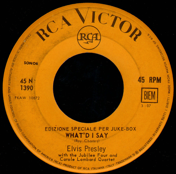 Label: RCA Victor – 45 N 1390 Format: Vinyl, 7", 45 RPM, Jukebox Country: Italy Released: 1964 Manufactured By – RCA Italiana S.p.A. Edizione Speciale per Juke Box, vietata la vendita al pubblico.(Special Edition for Jukebox. Not for public sale). Matrix / Runout (Runout area side A): PKAW 10871 1S 1B 2 |