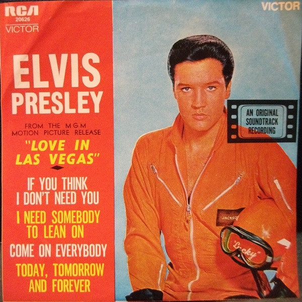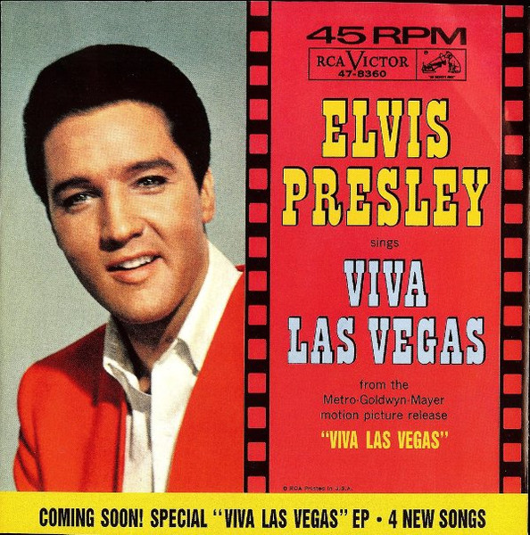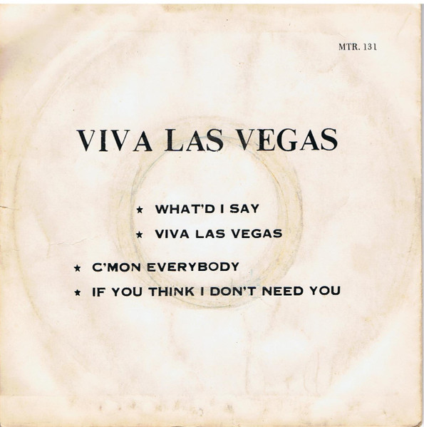 LAS VEGAS (EP) Front Cover : Picture sleeve. *Note* The listing notice for this release is 25th May 1964. On Average shipping would be around 10 days later, if that is the case with this, then the release date would be more June 1964 that May 1964. E.P. soundtrack from the motion picture "Viva Las Vegas", 1964. The film (and, consequently, the E.P. sountrack) received different titles around the world, like "Love in Las Vegas" (UK, Europe, etc.) and "Amor a Tôda Velocidade" ("Love at Full Speed", Brazil). Although most of the E.P. versions feature the initial four tracks, some have two tracks removed and replaced by alternative tracks, "Viva Las Vegas" and "What I'd Say". Another later issue features the Initial tracks plus the two alternatives on the same 7" vinyl. |