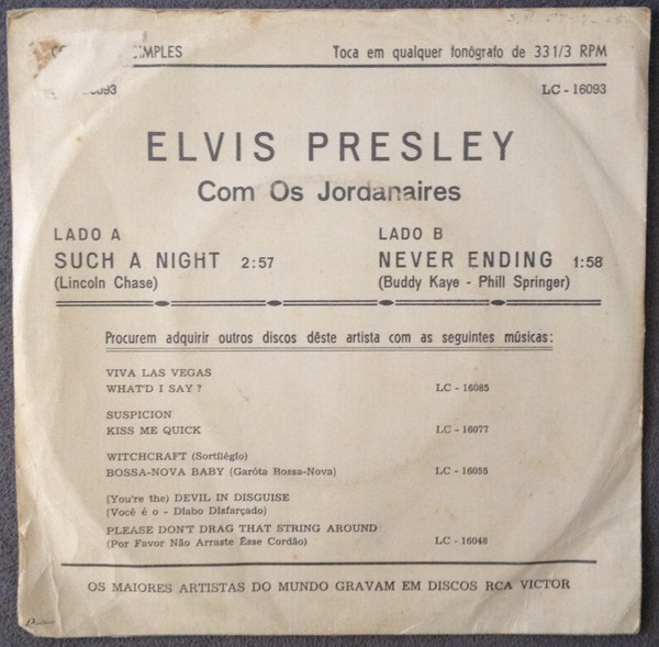 Label: RCA Victor – 31A-0529 Format: Vinyl, 7", 33 ⅓ RPM, Single Country: Argentina Released: 1964 Record Company – RCA Victor Argentina S.A.I.C. Backing Band [With] – The Jordanaires Original Argentinian Release. Titles in Spanish |