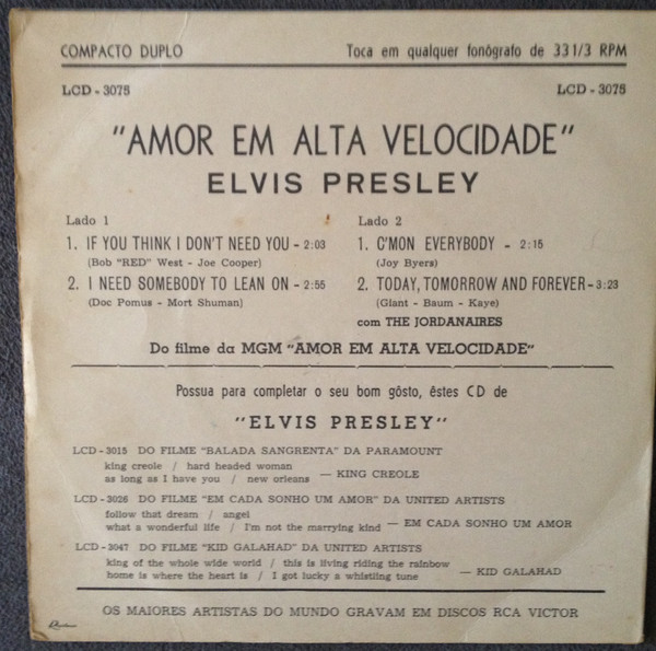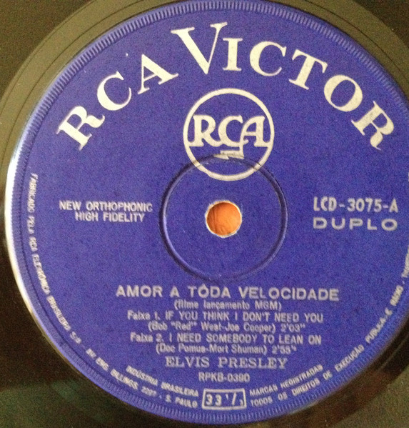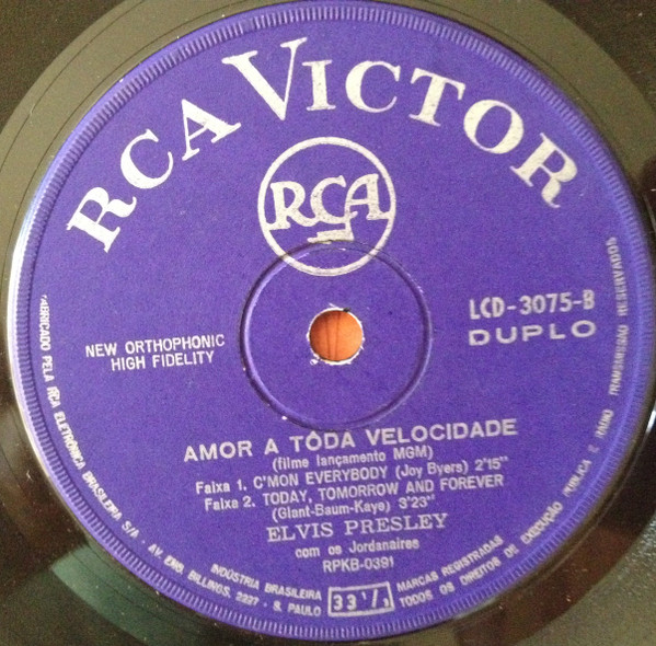 | Label: RCA Victor – LCD-3075 Format: Vinyl, 7", 33 ⅓ RPM, EP Country: Brazil Released: 1964 First Brazilian edition, 1964, blue labels with round RCA logo. The film's title was adapted to "Amor A Tôda Velocidade" ("Love at Full Speed") in Brazil. The record has the correct title on the front cover and labels, but the back cover has it as "Amor Em Alta Velocidade" ("Love in High Speed"). |